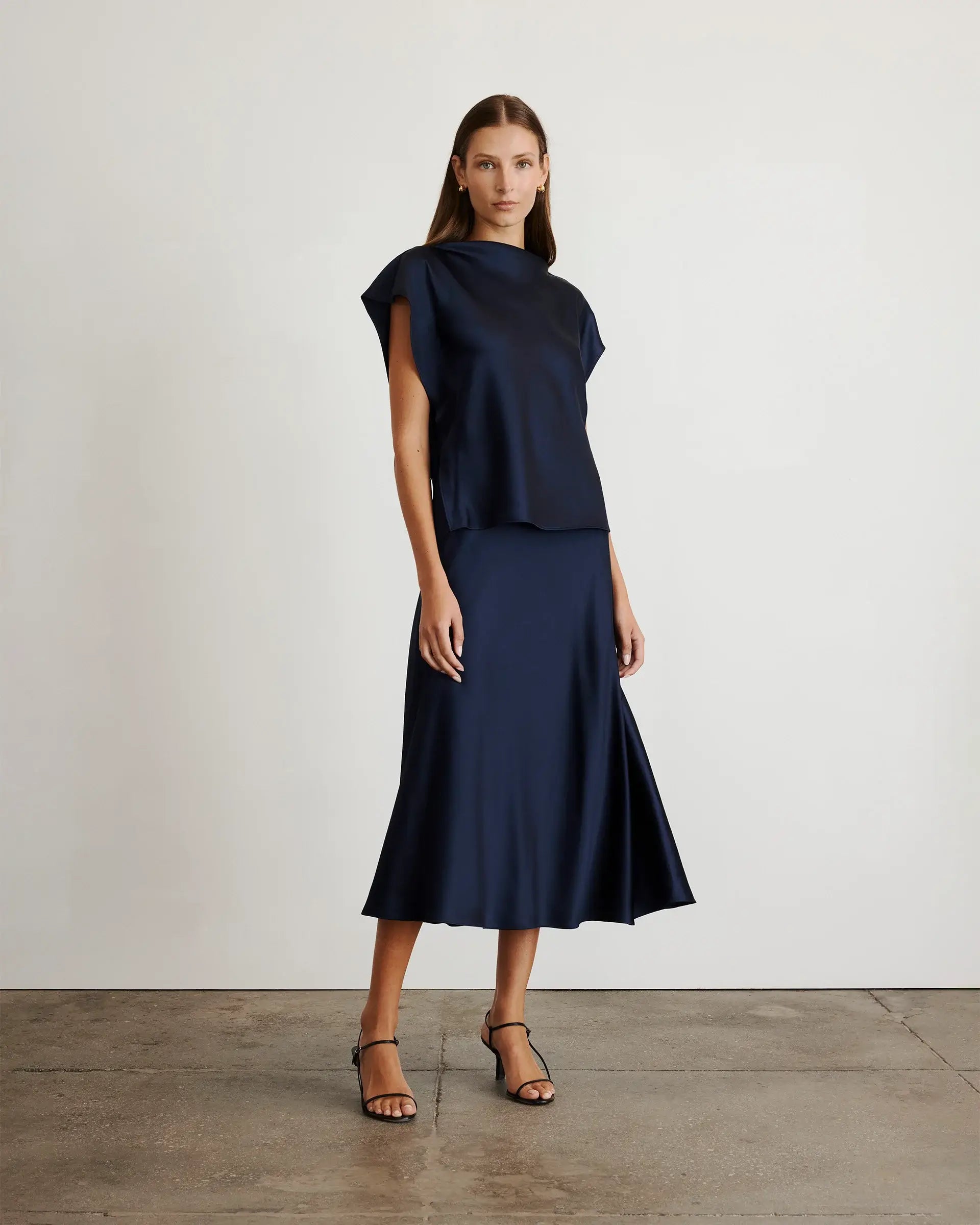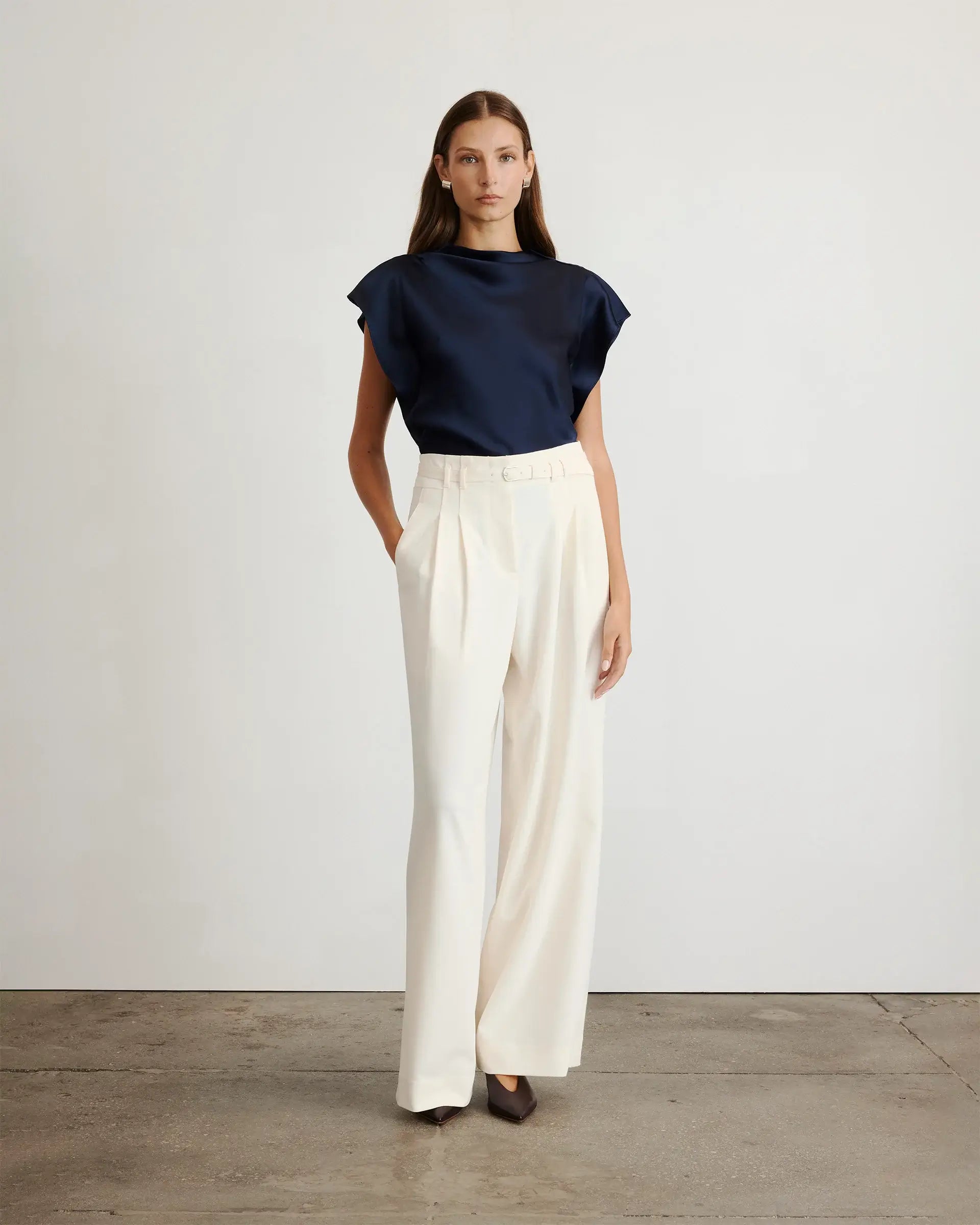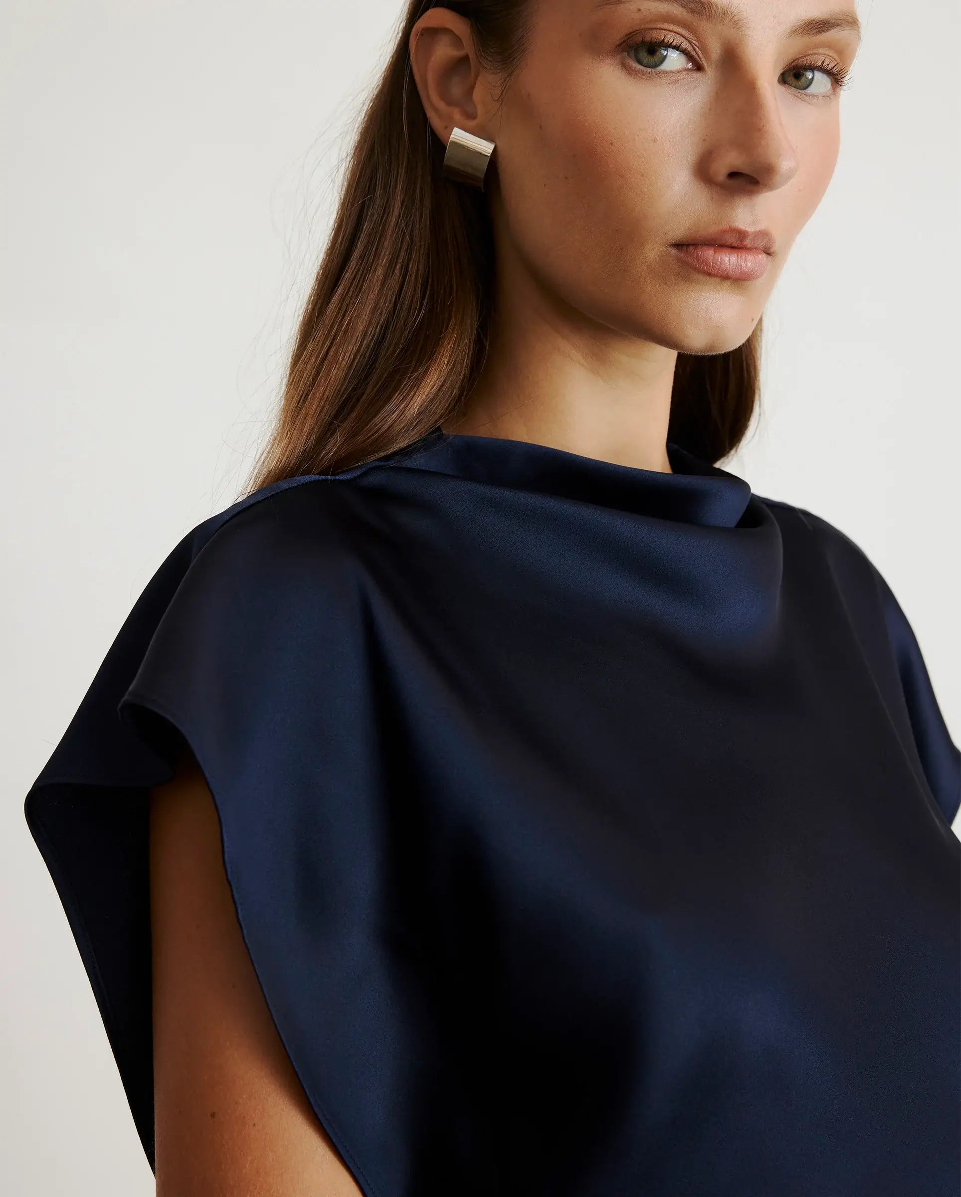 Bias-cut satin crepe top with draped neckline, short flutter sleeves, and hidden back zipper. Unlined. Fabric: 98% polyester, 2% elastane; lining: 100% polyester.