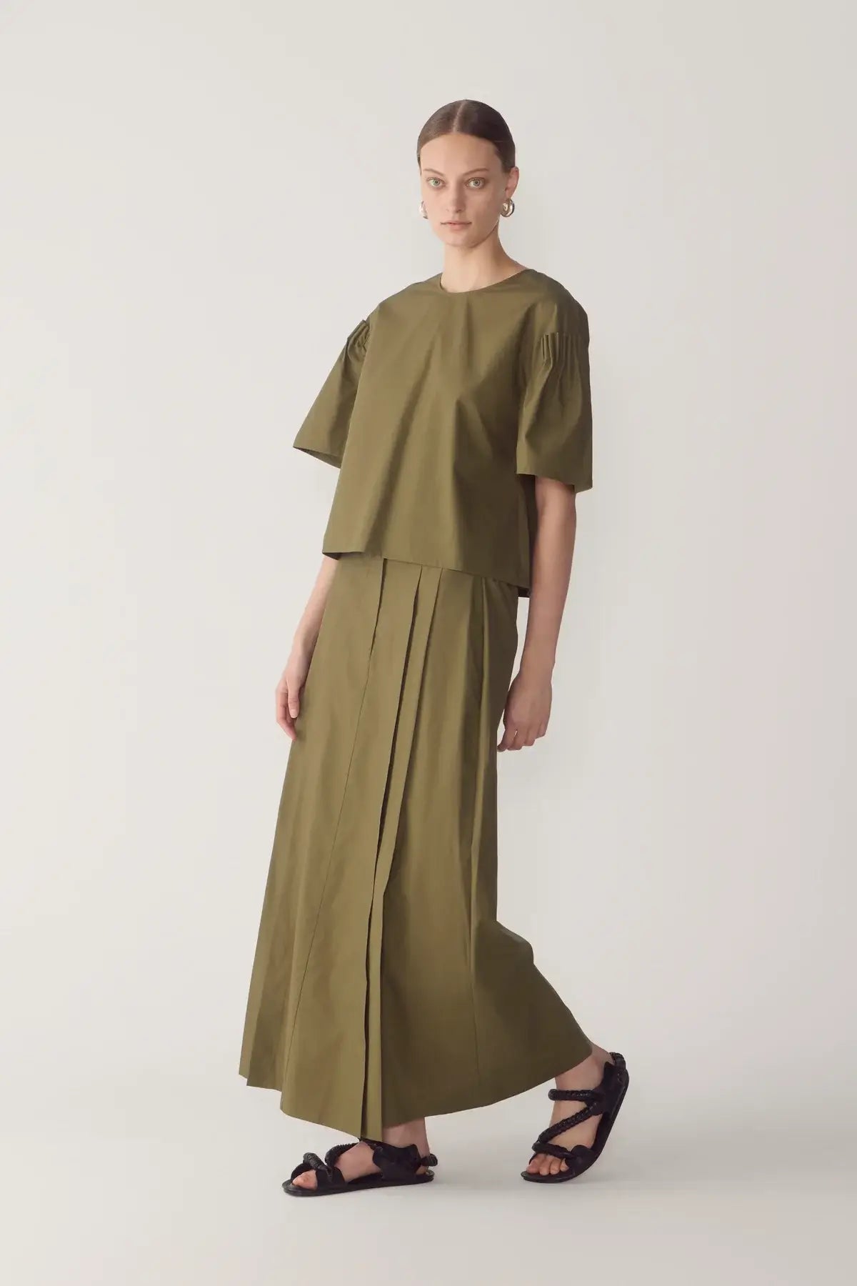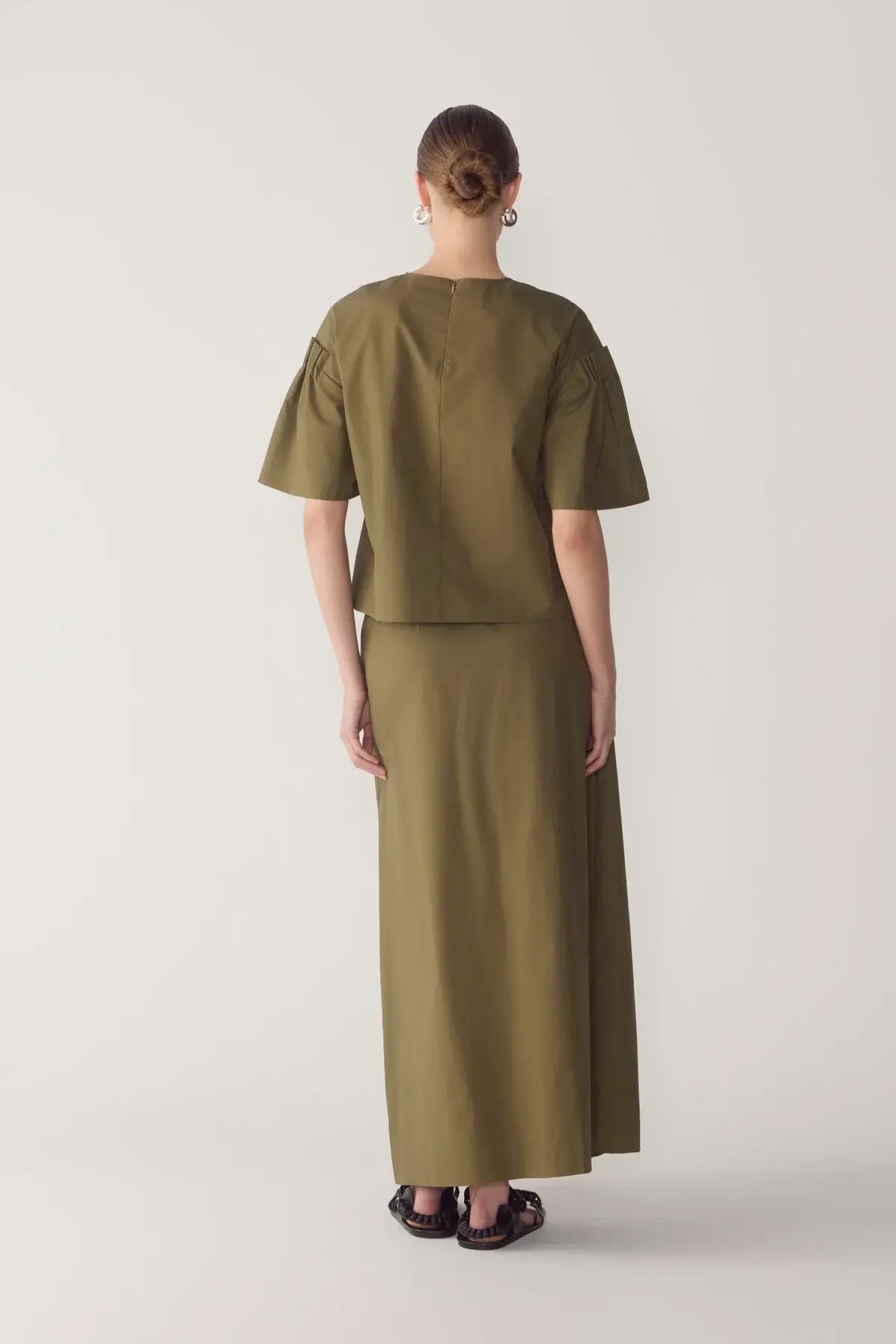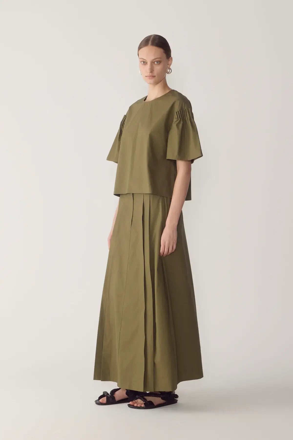 This top is defined by clarity of line and a singular sculptural gesture. Crafted from smooth cotton tencel, it features a clean round neckline and a concealed zip at the back, allowing the silhouette to fall straight and uninterrupted through the body. The dramatic bell sleeves form the centrepiece of the design, structured with precise pintuck detailing at the shoulder to create controlled volume and a strong architectural profile.