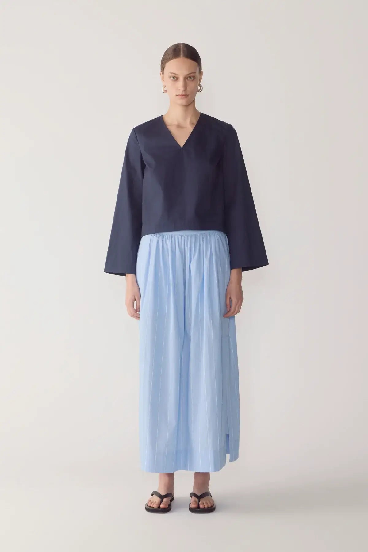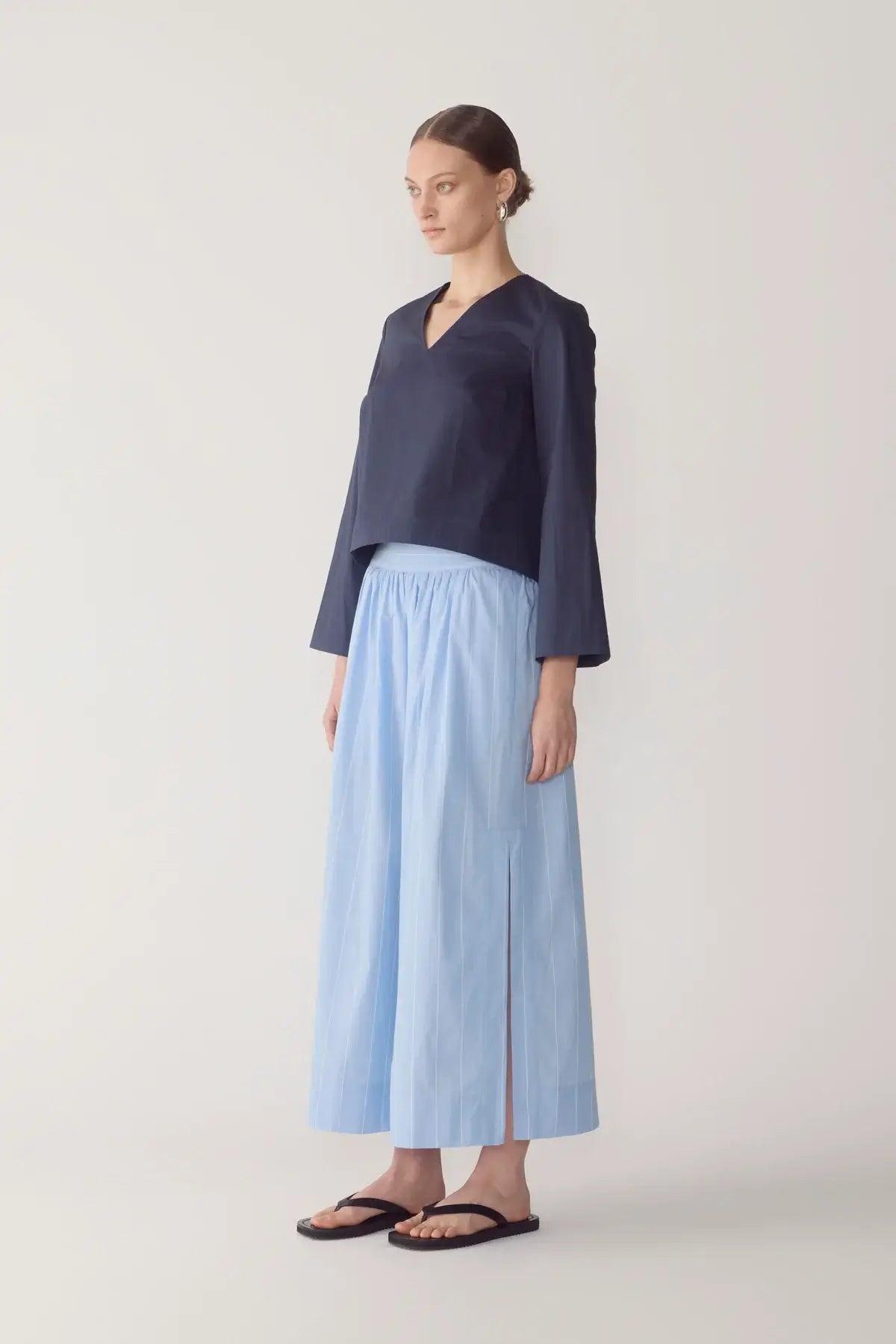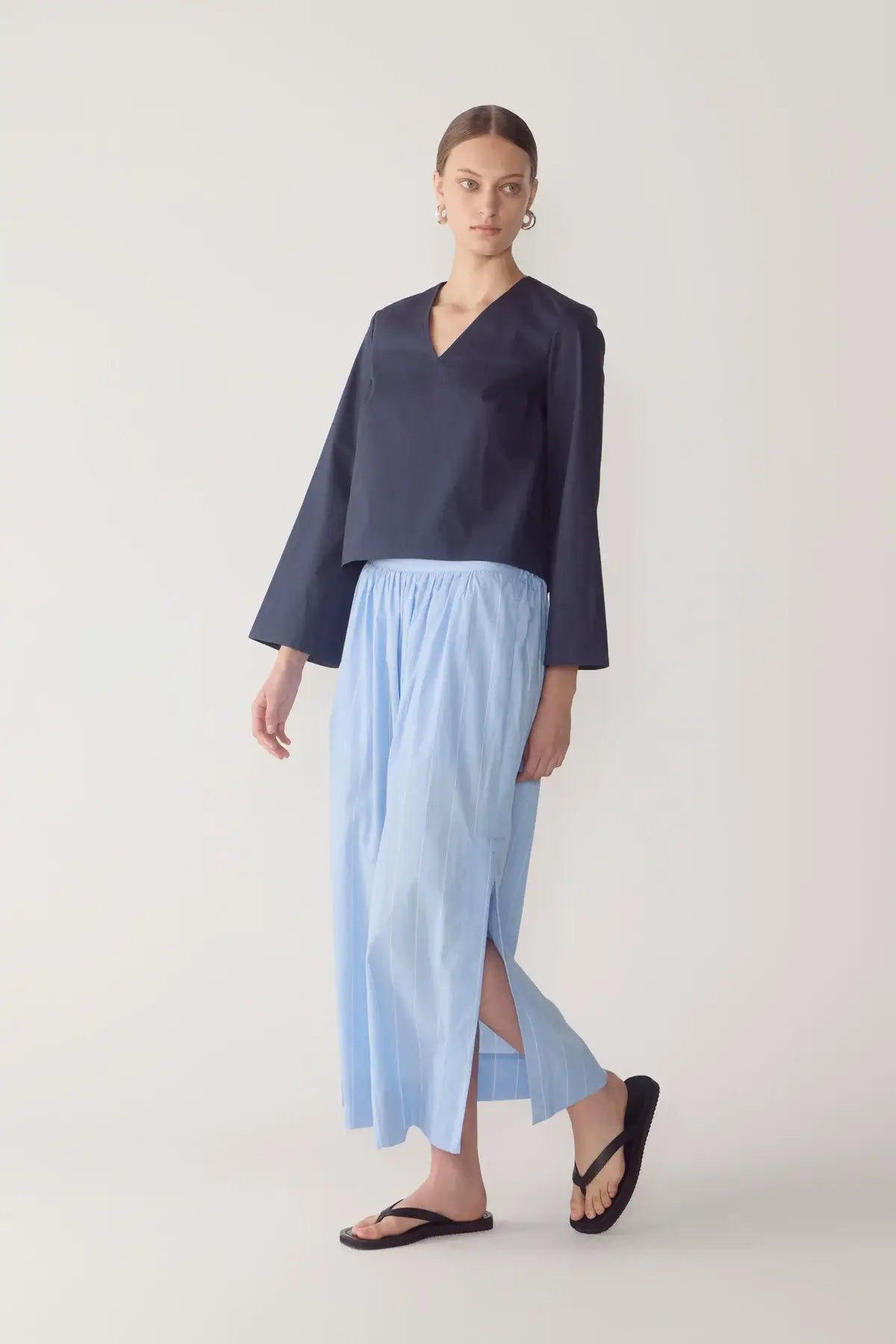 This top refines everyday structure through clean lines and deliberate proportion. Cut from crisp organic cotton poplin, it features a clean V-neckline and a refined back neck split secured with a button and loop closure. The silhouette is kept straight and relaxed, while fluted sleeves introduce a sculptural edge. A high-low hem adds quiet dimension, finished with an invisible zip at the back hem that can be opened to form a considered split.