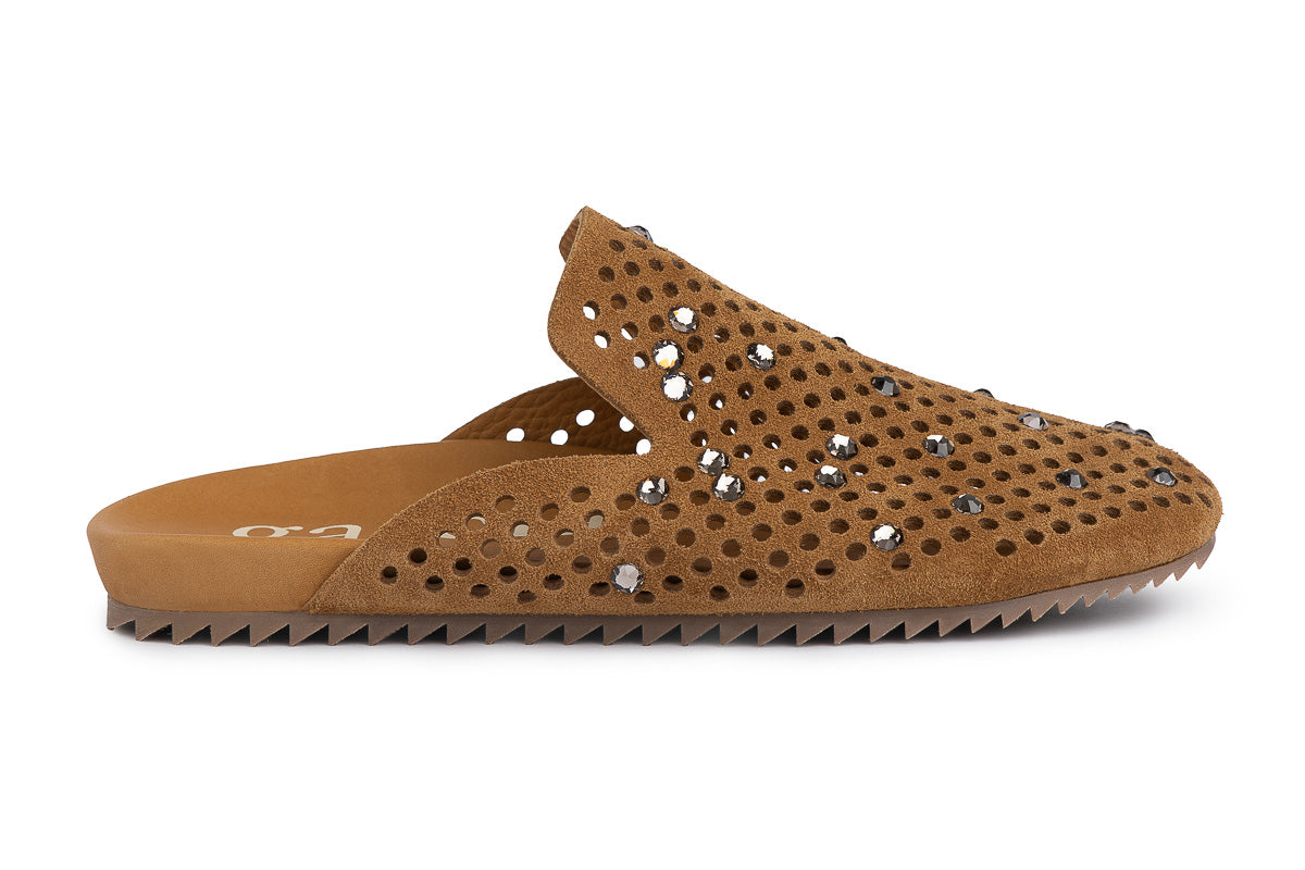 Made from unlined split cow suede with raw edge perforation and Swarovski® crystal embellishments. Features an anatomical cork and rubber footbed with a serrated TPU sole for traction and comfort. Includes a protective fabric pouch. Made in Spain.