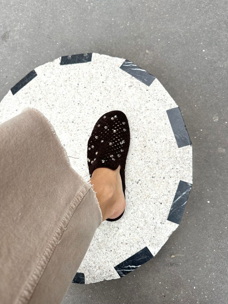 Crafted in unlined split cow suede with raw edges and perforated detailing, the Braidy sandals feature Swarovski® crystal studs that add just the right amount of sparkle. Designed with an anatomical cork and rubber footbed and a lightweight serrated TPU sole, they balance comfort, craftsmanship, and modern edge. Comes complete with a protective fabric pouch.
