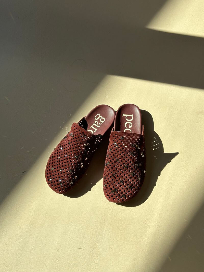 Made from unlined split cow suede with raw edge perforation and Swarovski® crystal embellishments. Features an anatomical cork and rubber footbed with a serrated TPU sole for traction and comfort. Includes a protective fabric pouch. Made in Spain.