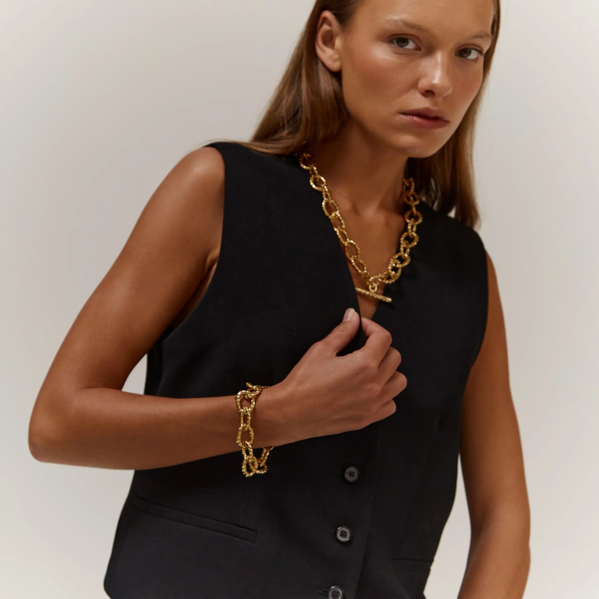 Add to your wrist with this handmade 18kt gold plated pewter metal chain texture bracelet. Effortlessly transition from day to night with this versatile piece, whether you're attending a boardroom meeting or dancing the night away at your favorite rooftop bar, it's the perfect accessory to elevate any look.