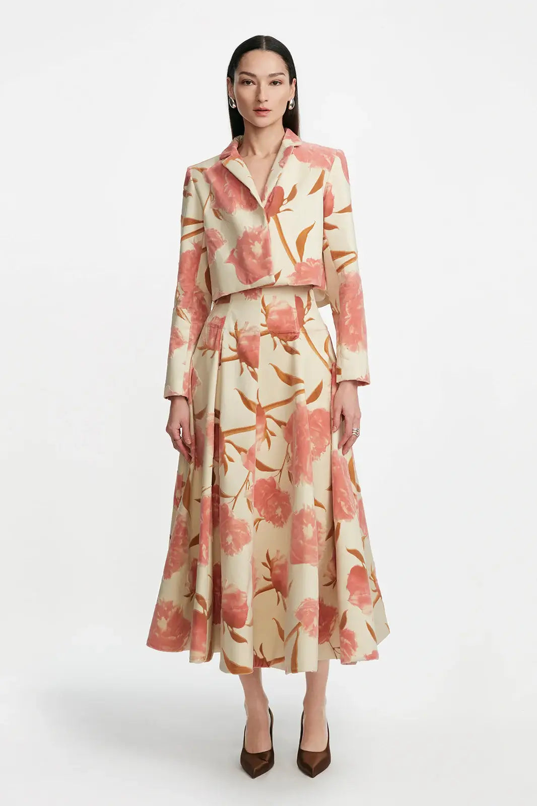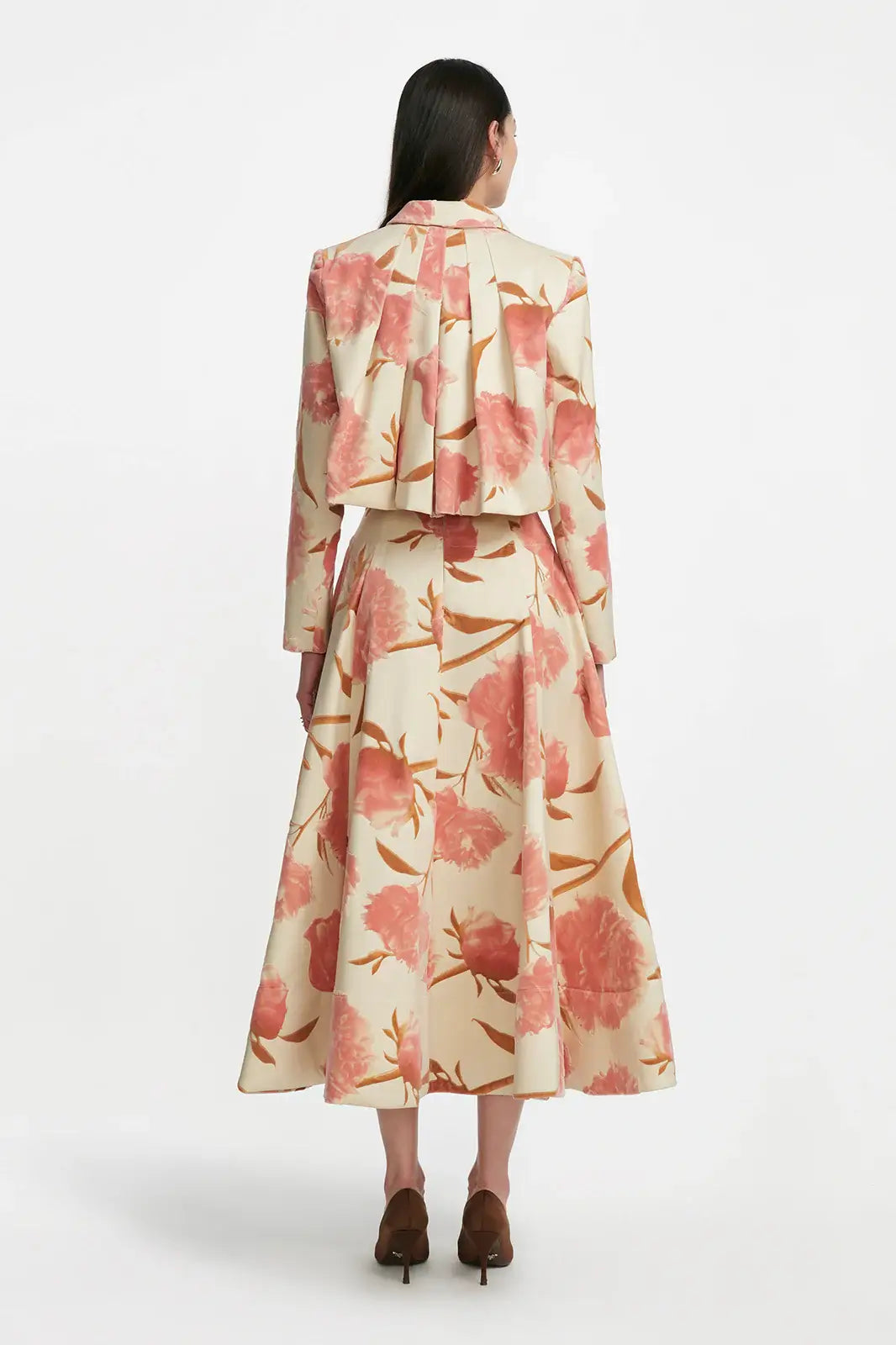 Crafted in luxe floral velvet, the Cropped Tucked Jacket is a novel silhouette for the Fall season. Featuring a tailored shape in the front, with a notch collar and hidden center front buttons, and gathered paneling in the back for a dimensional drape, this silhouette is modern yet feminine. Pair with the coordinating Parker Skirt, with denim, or your favorite trouser.