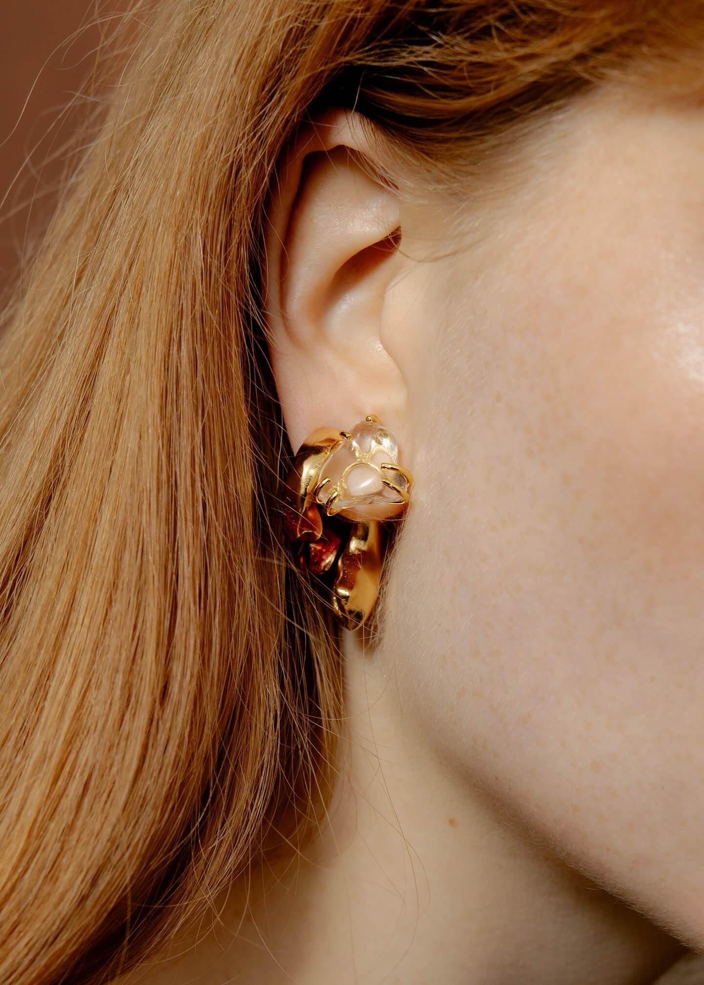 Handcrafted with natural crystal quartz and 24k gold-plated bronze. Finished with cataphoretic lacquer. Hollow design for lightweight comfort. Approx. 3.2 cm long, 1.8 cm wide, and about 6 g per earring.