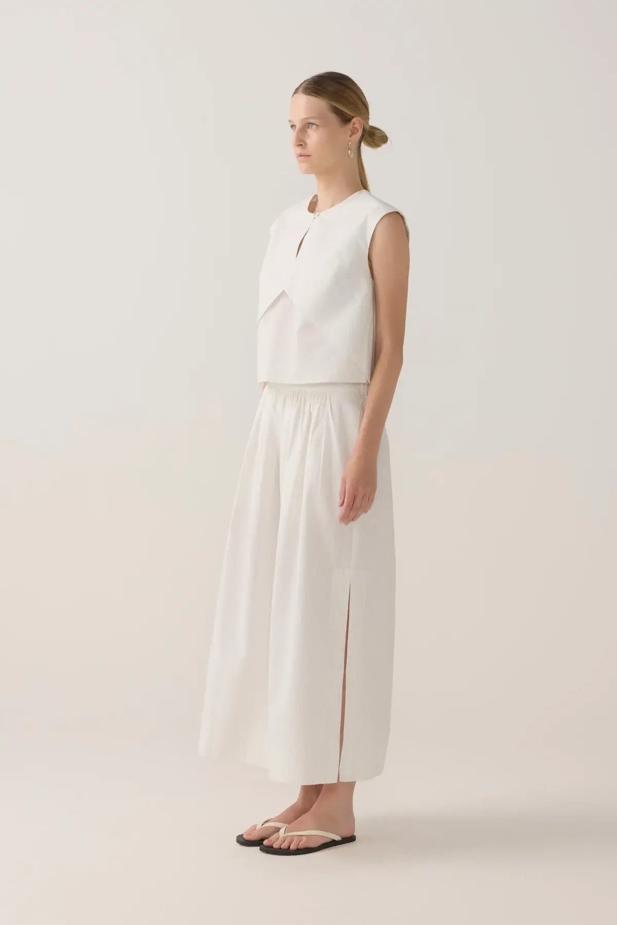 Crafted in organic cotton poplin, this sculptural top explores clean lines and thoughtful layering. Designed with a round neckline featuring a subtle split and button-and-loop closure, it is finished with a distinctive V-shaped layered panel at the front and back. A concealed back zip creates a refined split and allows for a customisable fit, balancing structure with ease. Worn with the Bobby Skirt in White Pinstripe.