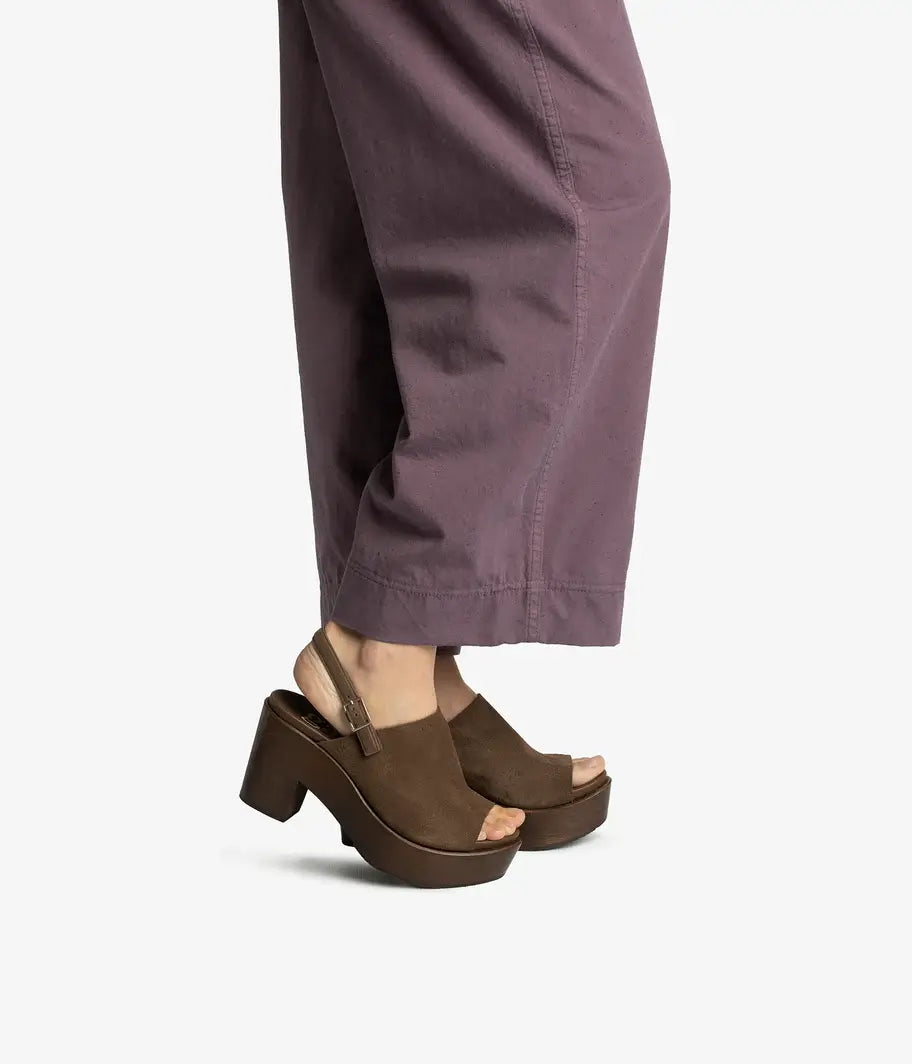 Unlined raw-edge suede upper, buckle closure, anatomical rubber/cork insole. Stained pine wood platform with anti-slip TPU sole. Heel height 3.3" (8.5 cm) with 1.3" (3.5 cm) platform. Made in Spain.