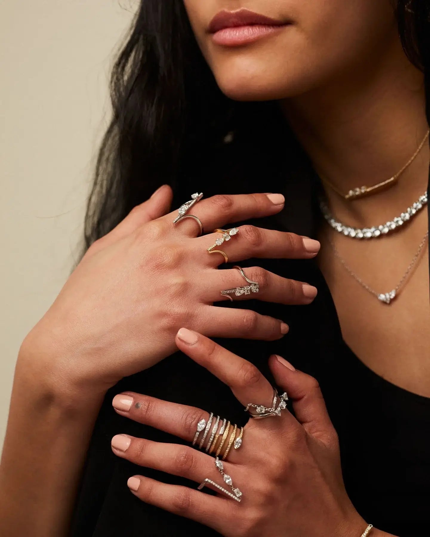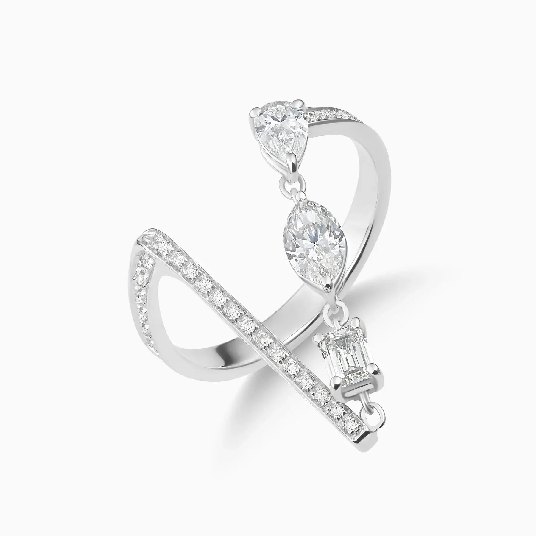 The Dizzy Swing Ring is a tiny diamond necklace… for your finger. Three brilliant diamonds dance on a delicate chain, giving you sparkle that actually moves. Unexpected, playful, and seriously pretty.