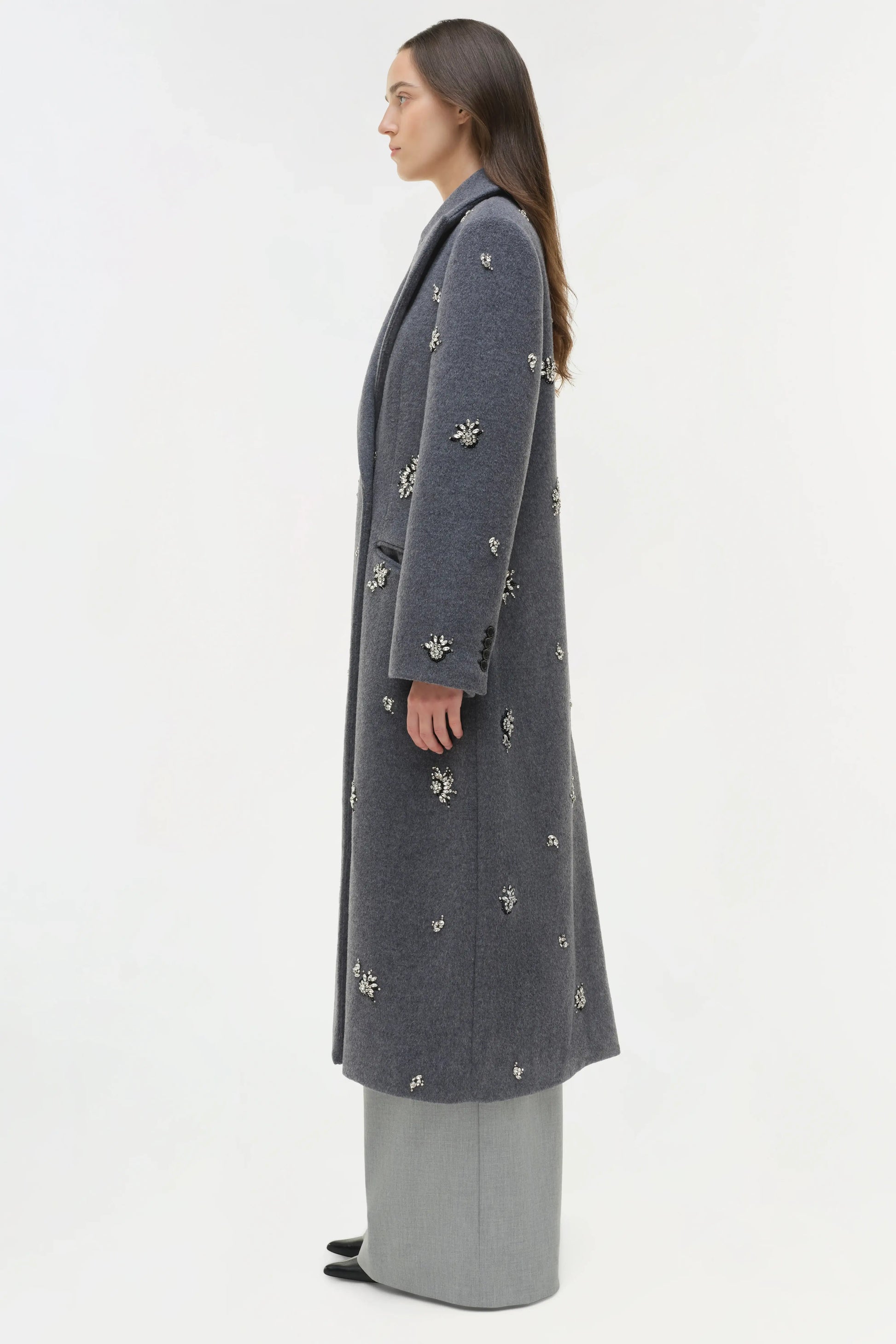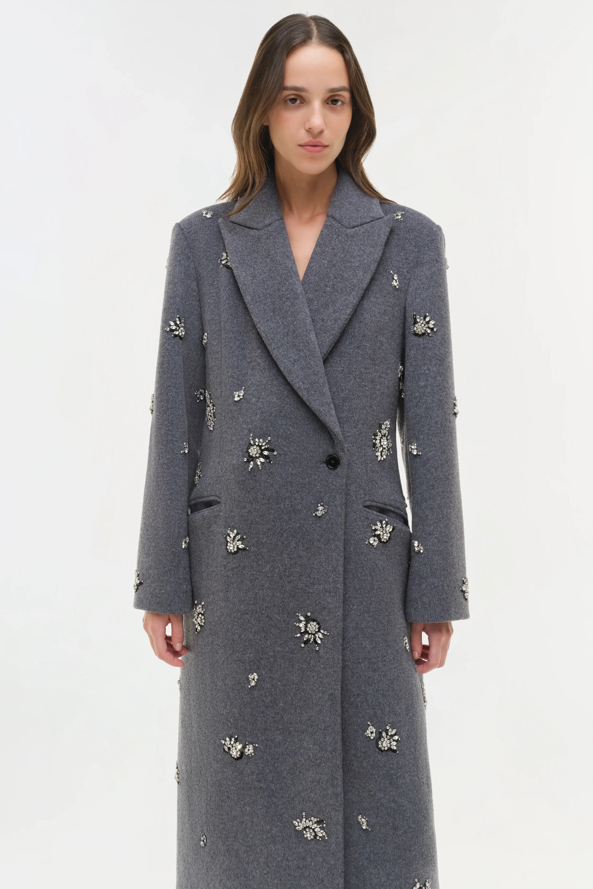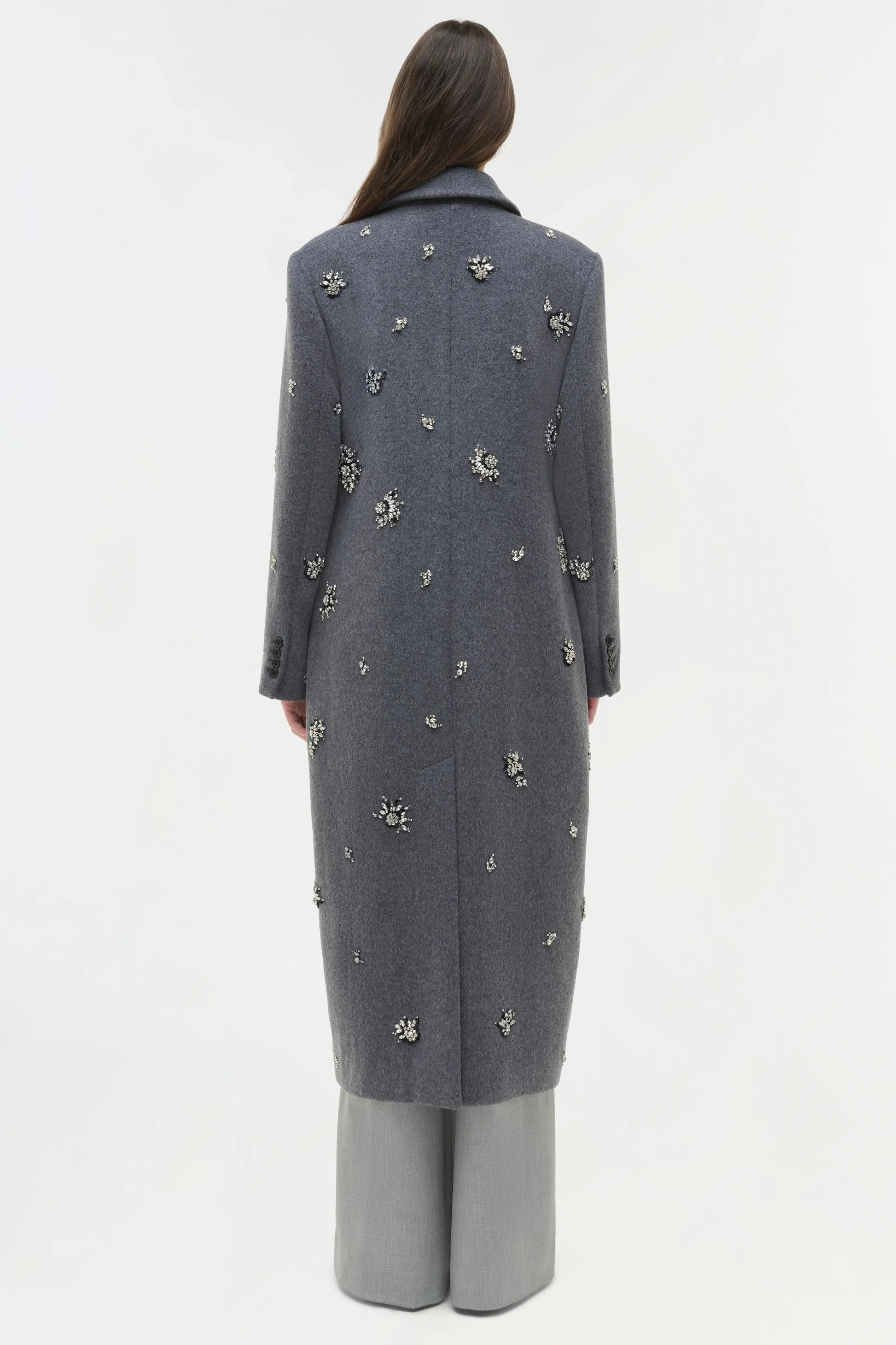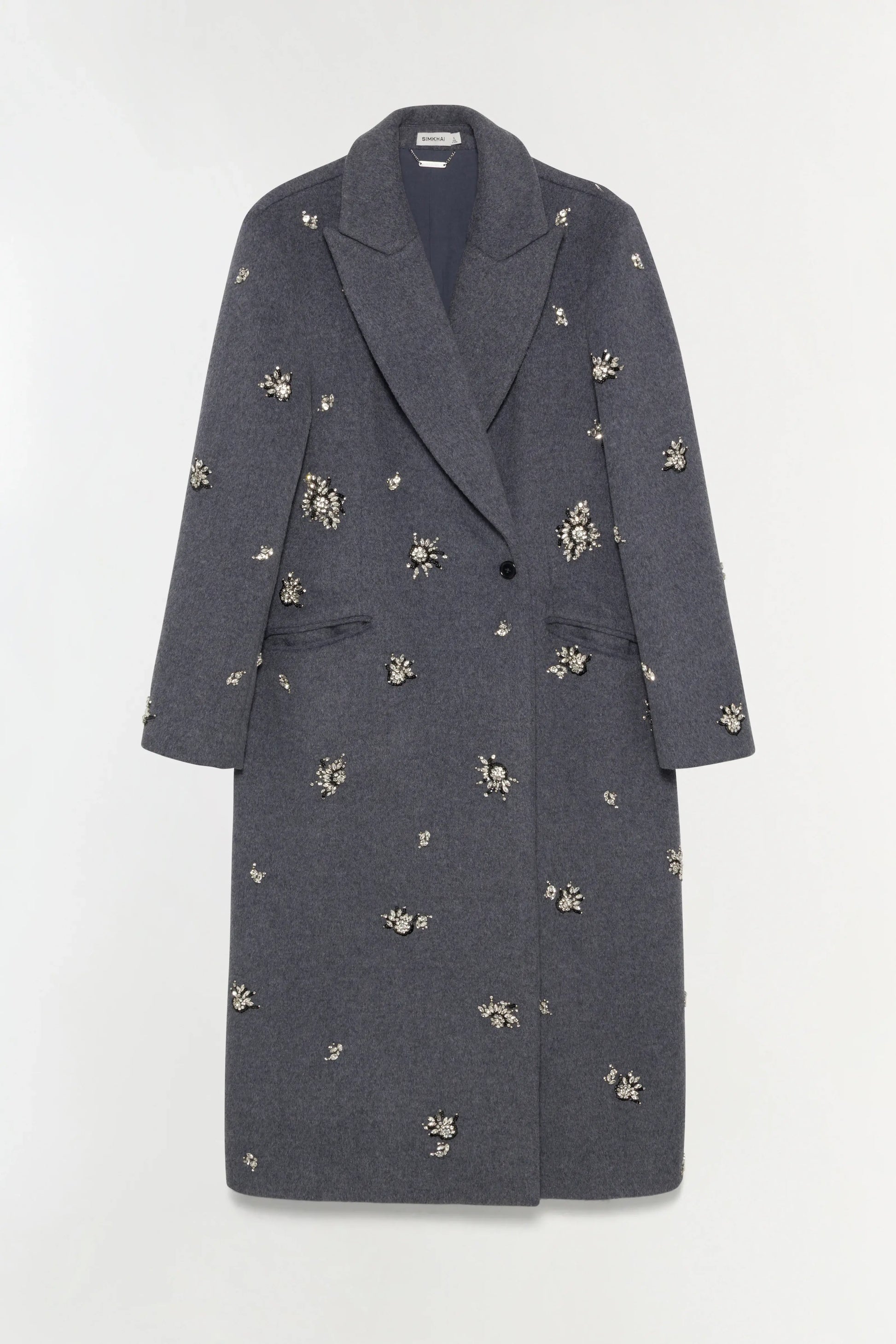 A full length wool coat in a timeless notch collar construction with long sleeves and a side button closure; updated with allover embellishments.