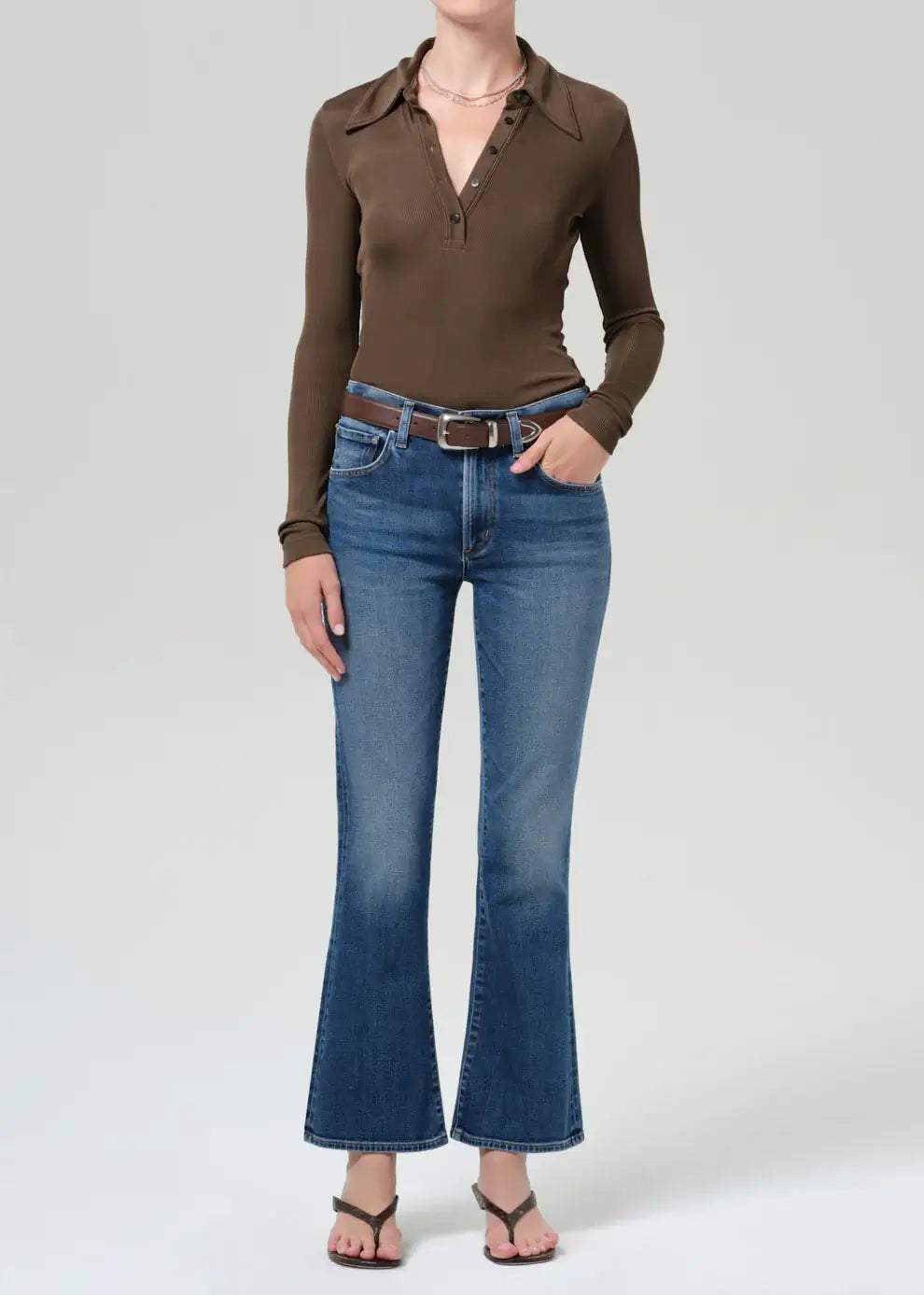 The Goldie offers a refined interpretation of ‘70s-inspired denim. Designed with a mid rise and a subtle kick-flare hem, the silhouette creates a long, balanced line that feels both timeless and modern. Crafted from comfort-stretch denim in a medium indigo wash, it has a super-soft hand and gently structured drape for all-day wearability. The perfect blend of ease and sophistication—an effortless go-to for elevated everyday dressing.