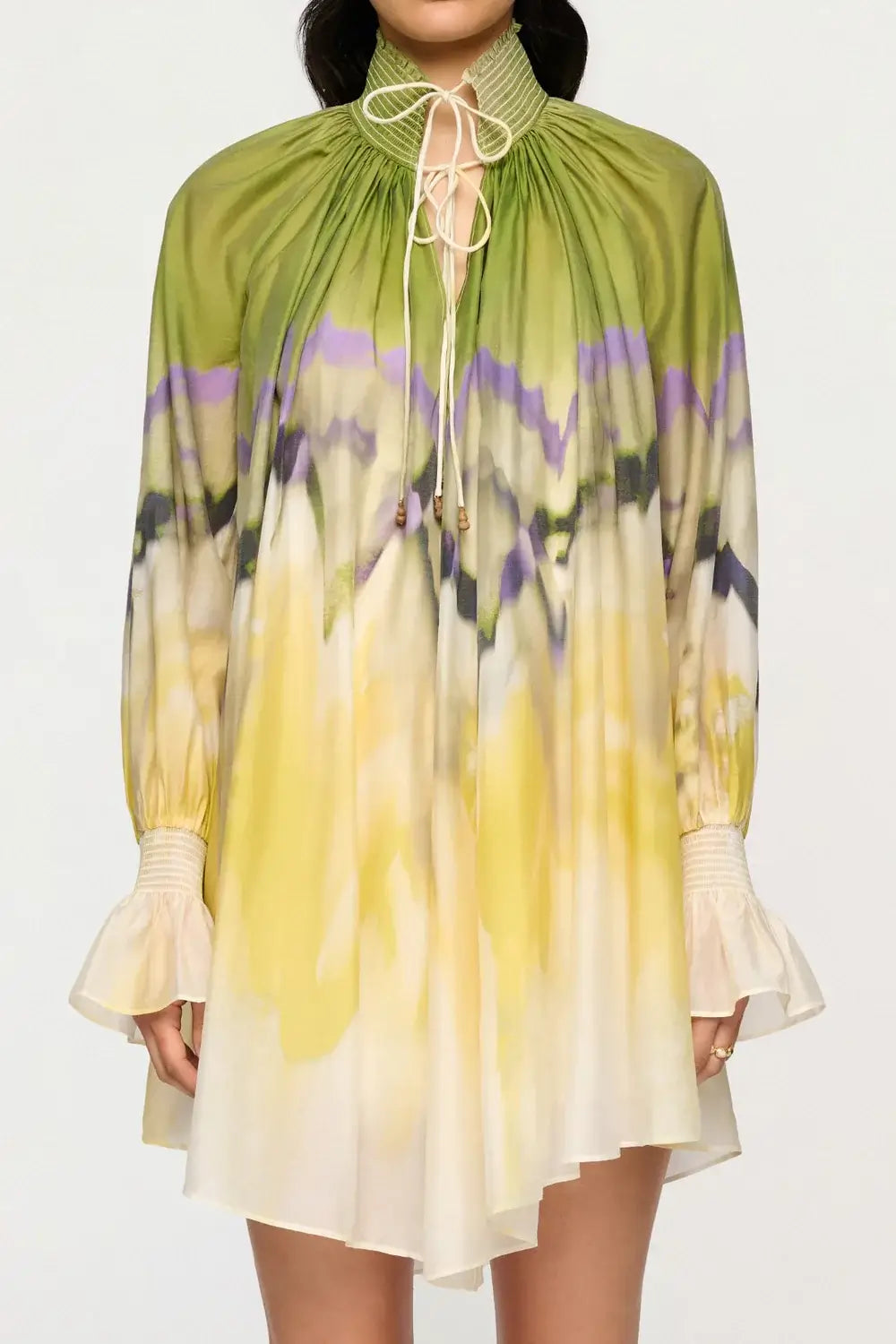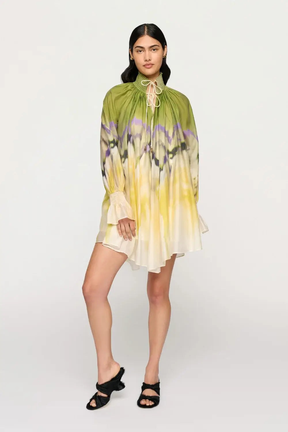 A voluminous silhouette with lightness and movement. The Isadora Mini Dress is crafted from a sheer, lustrous fabrication that drapes fluidly, creating a sense of air and ease.