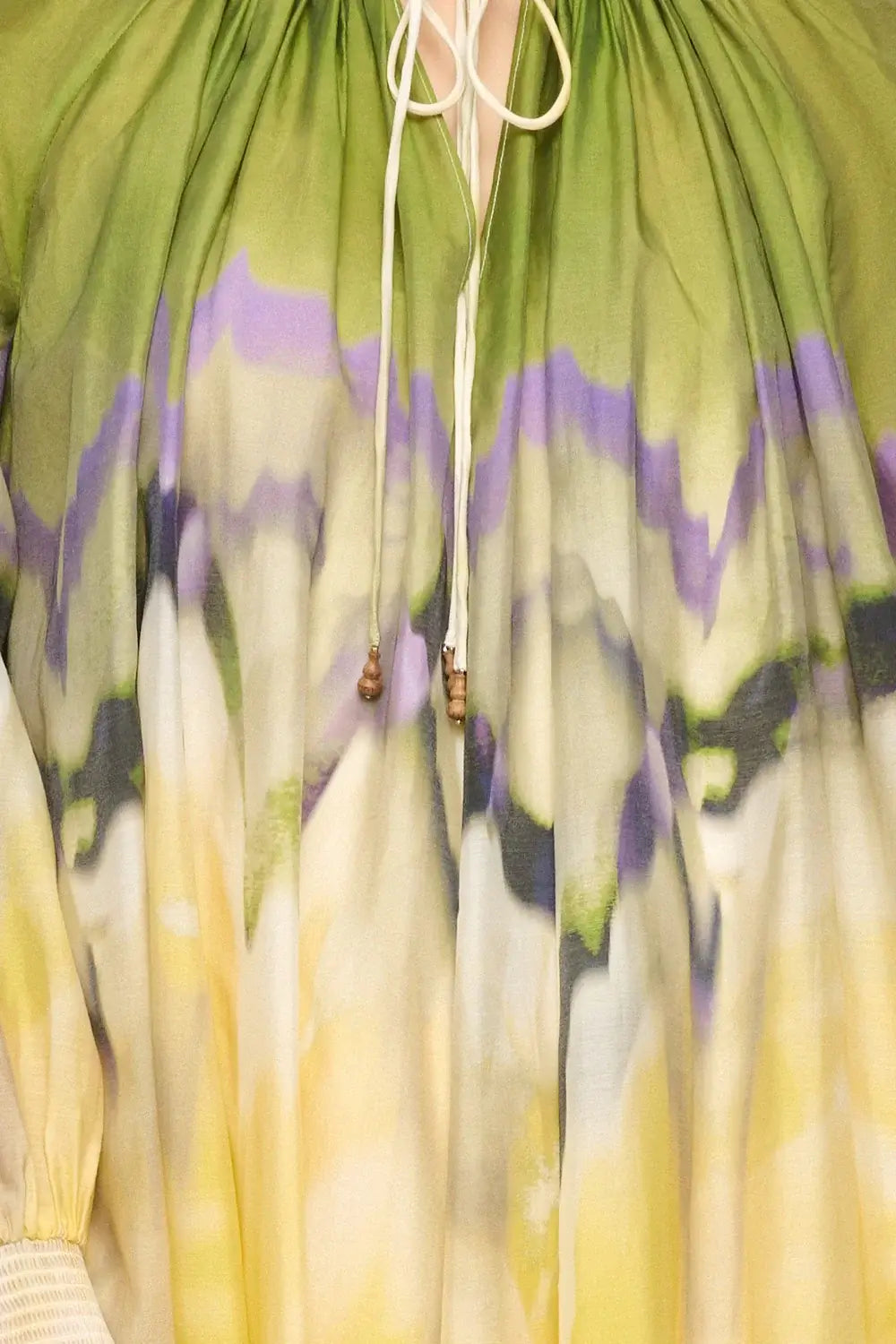 Soft gathers frame the neckline, finished with a shirred collar stand and self rouleaux ties. A front split adds openness, while full sleeves gather into shirred cuffs, secured with a delicate button finish. The dipped hemline adds shape to the profile, finished with a fine double-turn hem.