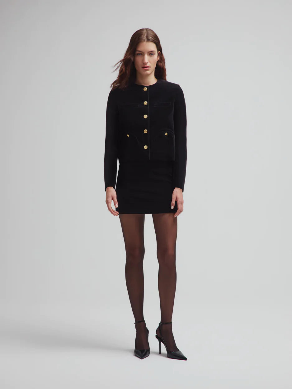In BLAZÉ Jealousy Black cotton velvet, the Shamo Bolero showcases a slim silhouette, cropped just above the hips. Accentuated by gold-toned buttons, it suits with the matching pants for a complete look.