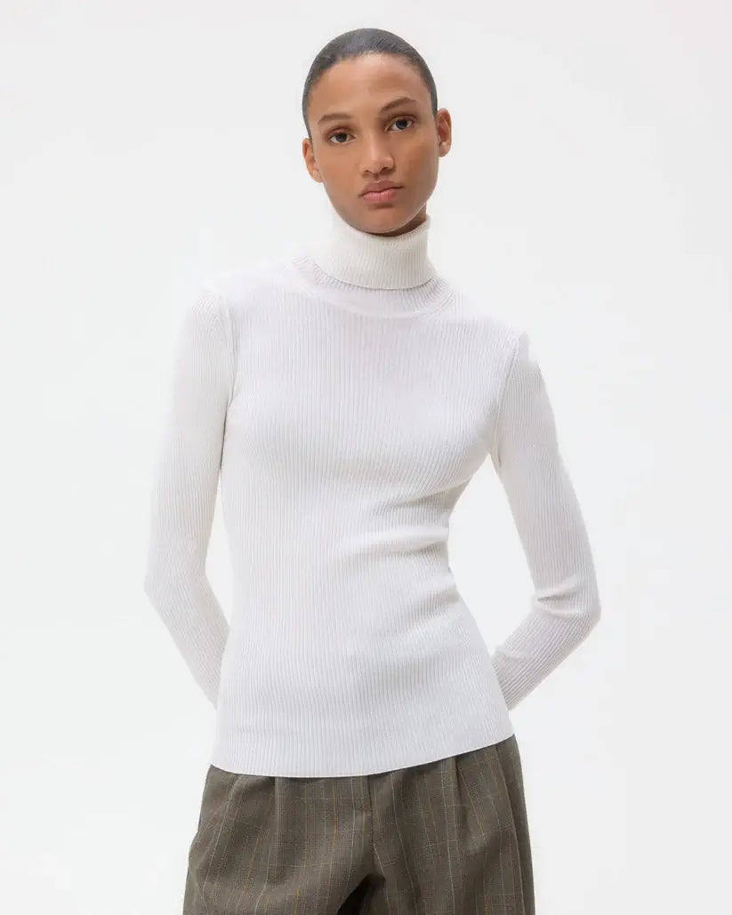 Turtleneck, long sleeved top knitted in luxe merino wool. The Knit Turtleneck is a ribbed, fully fashioned, form fitting top. Layer it underneath an oversized button down.