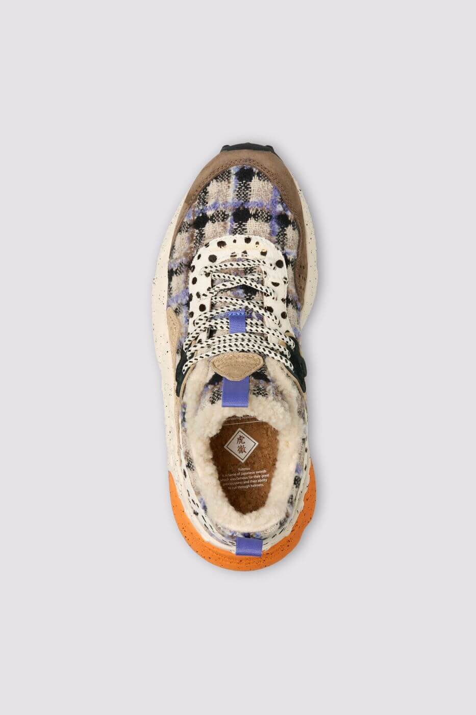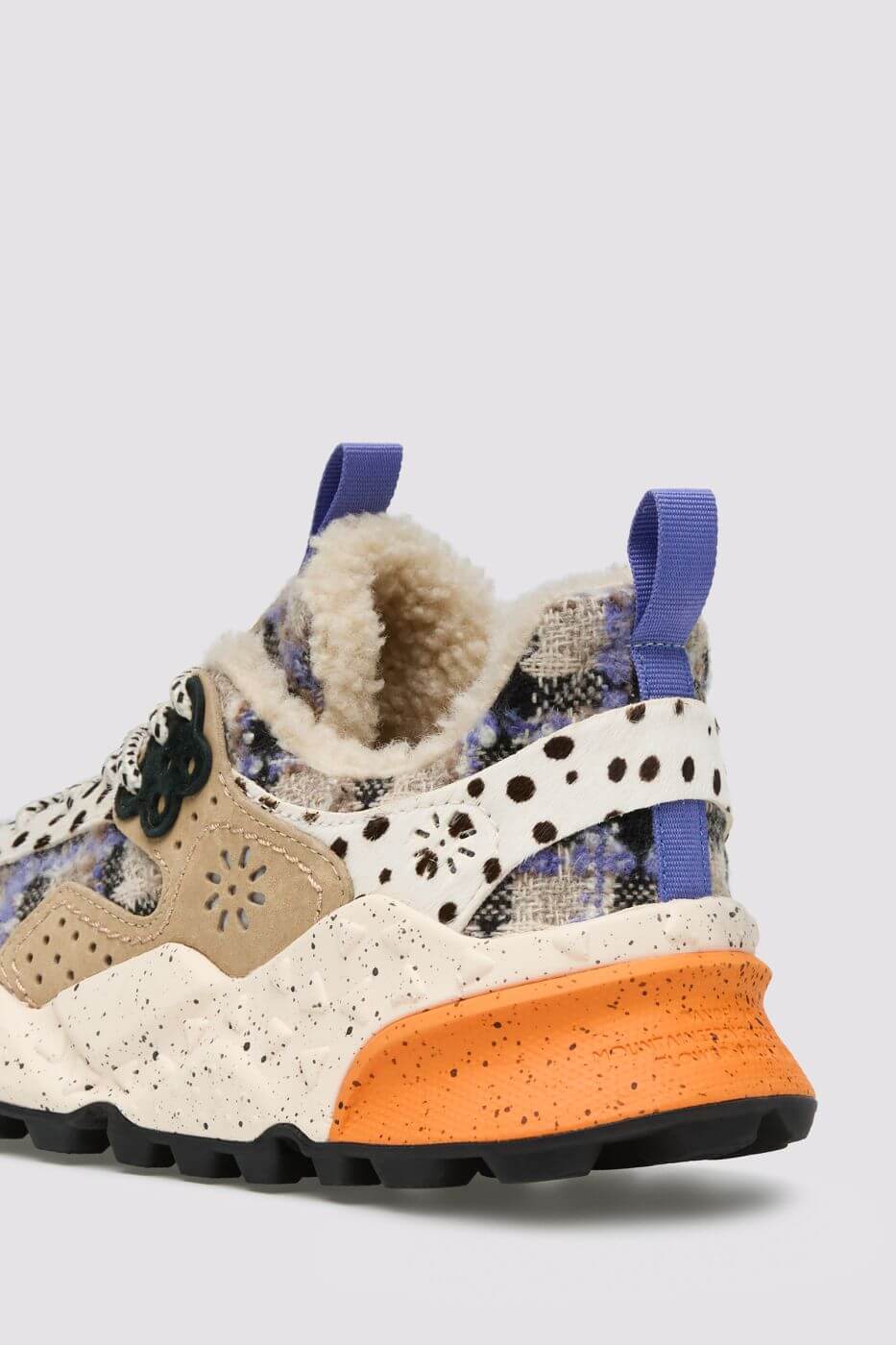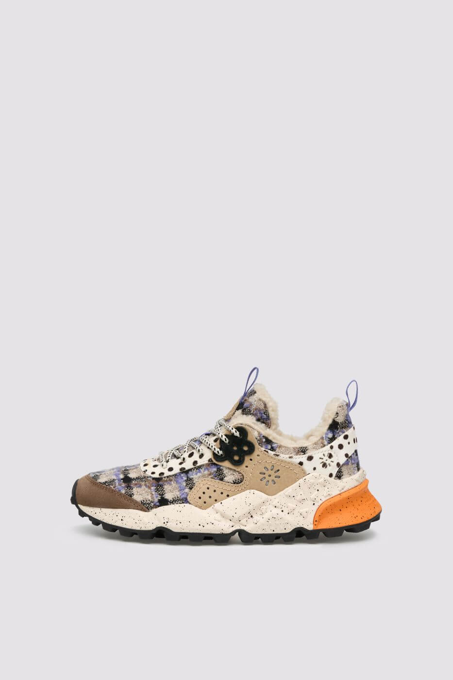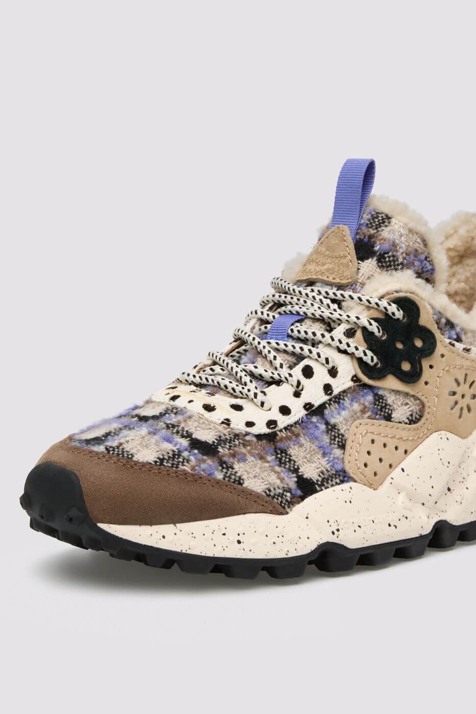 The Kotetsu by Flower Mountain blends rugged function with refined detail. Designed in tartan fabric with contrasting suede panels, these sneakers feature trekking laces and a shaped eyelet for a sporty edge. A bouclé-effect wool lining and natural cork insole provide warmth and comfort, while the ultra-light two-tone rubber sole ensures effortless wear all day.