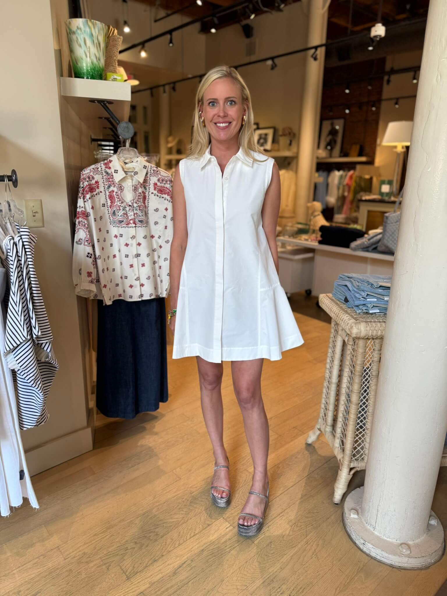 A structured, sleeveless mini dress with a collared neckline, hidden button placket, and subtle flared hem.