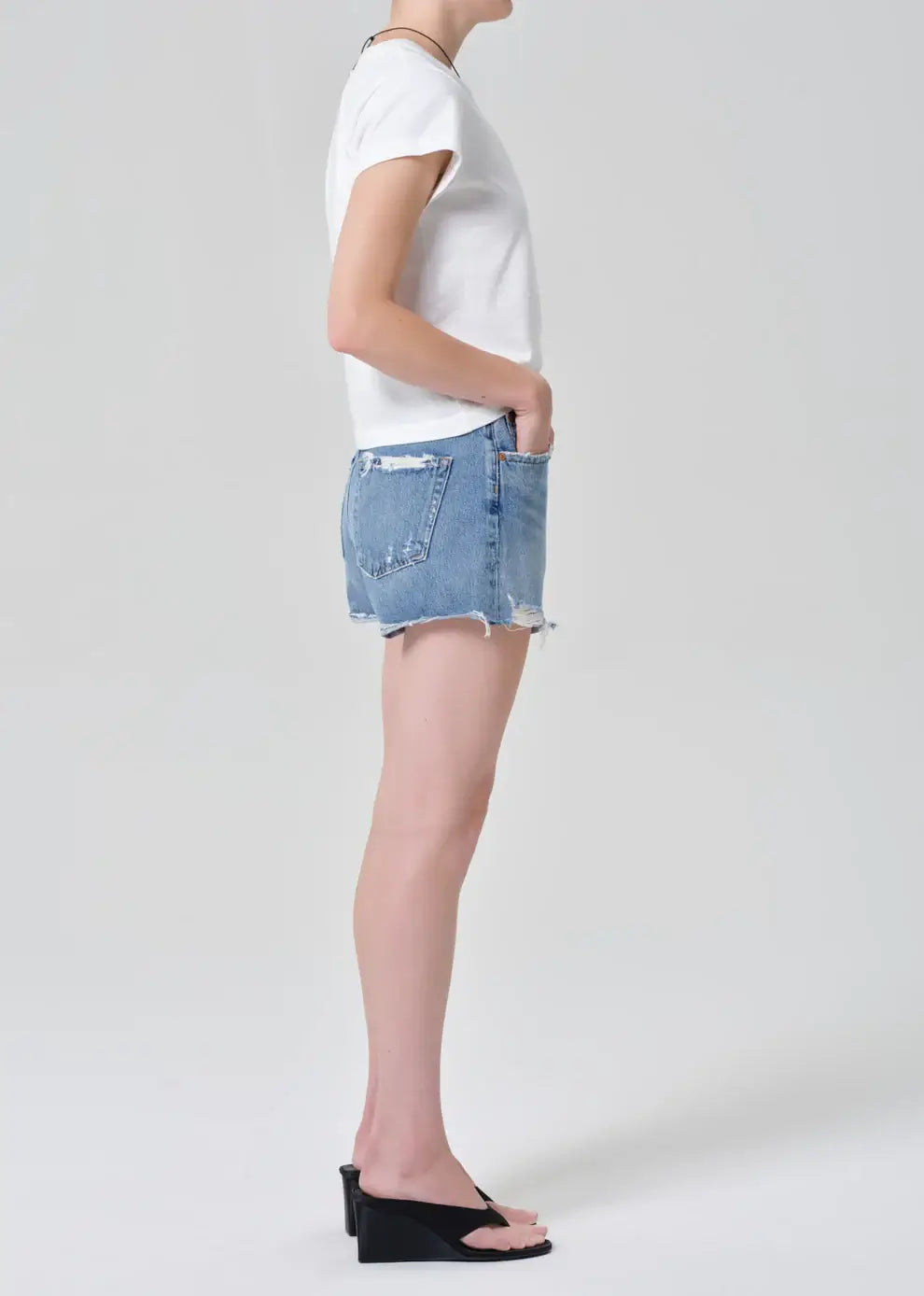 Looks Like: Medium to light indigo denim short with raw hem