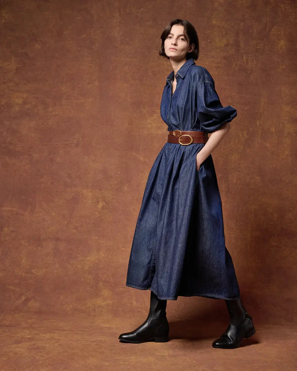 Long-sleeve shirtdress in denim shirting. The Mason Dress has a fitted bodice with contour seaming that releases into a full, midi-length skirt. Finished with a button-front placket, side seam pockets, and volume at the sleeves.
