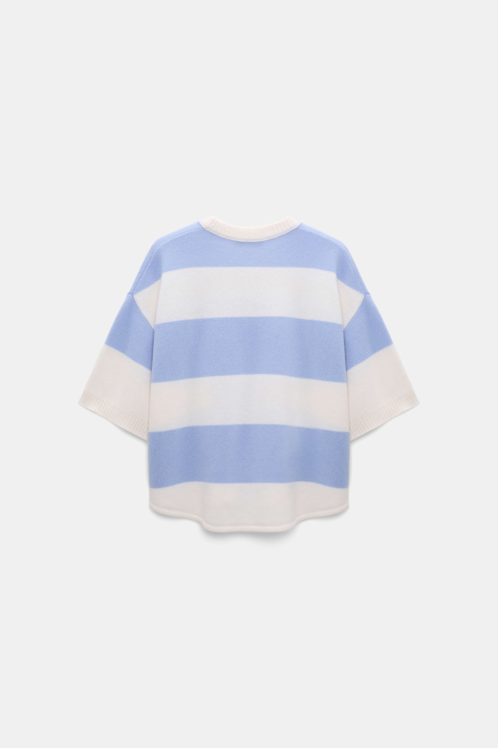 Short-sleeve sweater in a soft wool and cashmere blend with cream and blue horizontal stripes. Designed with a relaxed, slightly oversized fit that hits at the hip.