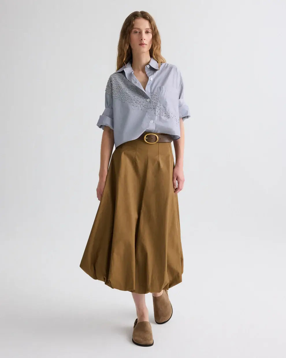The Next Ex takes TWP’s beloved short-sleeve button-down and turns up the glamour. Cut in ultra-fine Italian striped cotton shirting, this cropped, boxy silhouette is hand-embellished with crystals for a subtle sparkle that feels both elevated and effortless. Finished with a chest patch pocket, spread collar, and TWP’s signature double-roll cuffs, it’s the perfect mix of classic tailoring and playful shine.