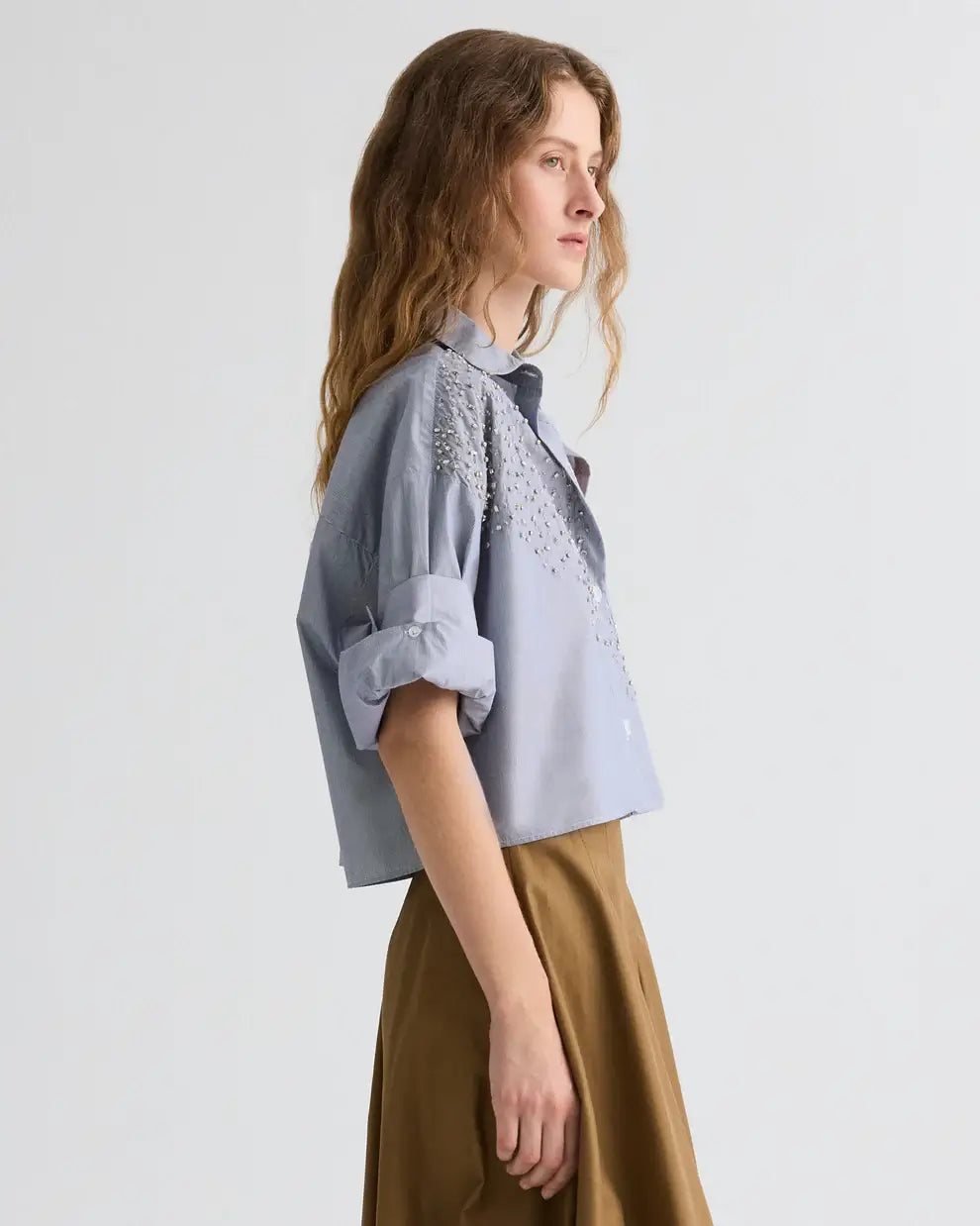 Cropped, boxy short-sleeve button-down with crystal embellishment, chest patch pocket, button-up placket, spread collar, and double-roll cuffs. Made from ultra-fine Italian striped cotton shirting. Fabric: 100% cotton.