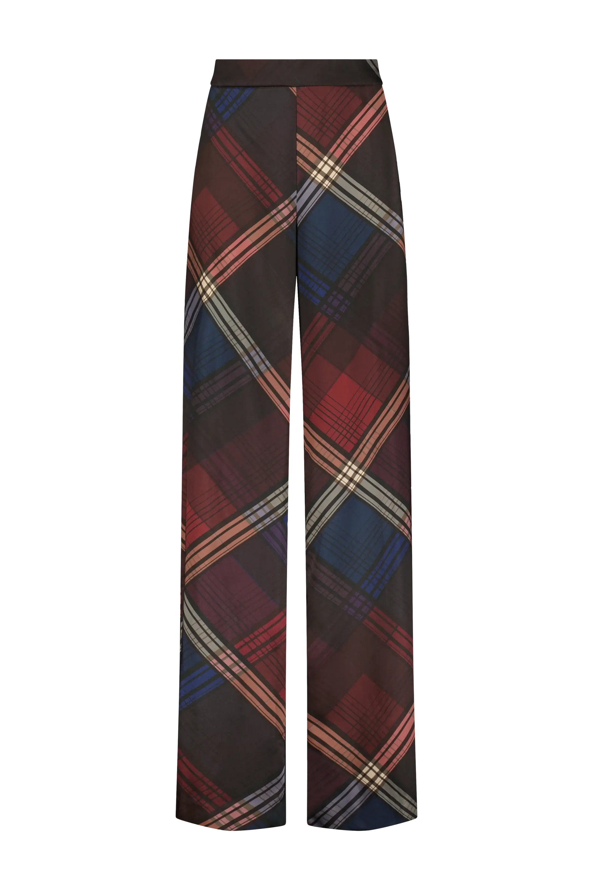 Crafted in luxe satin, the Sara Pant is an instant classic. Featuring an updated high-rise waist, straight leg, impeccable drape, and pull on styling that redefines tailored comfort. The thoughtfully constructed plaid panelwork highlights the contrast colorations in the season's signature plaid. Pairs perfectly with the Plaid Satin Button Down Blouse or the season's fresh separates.