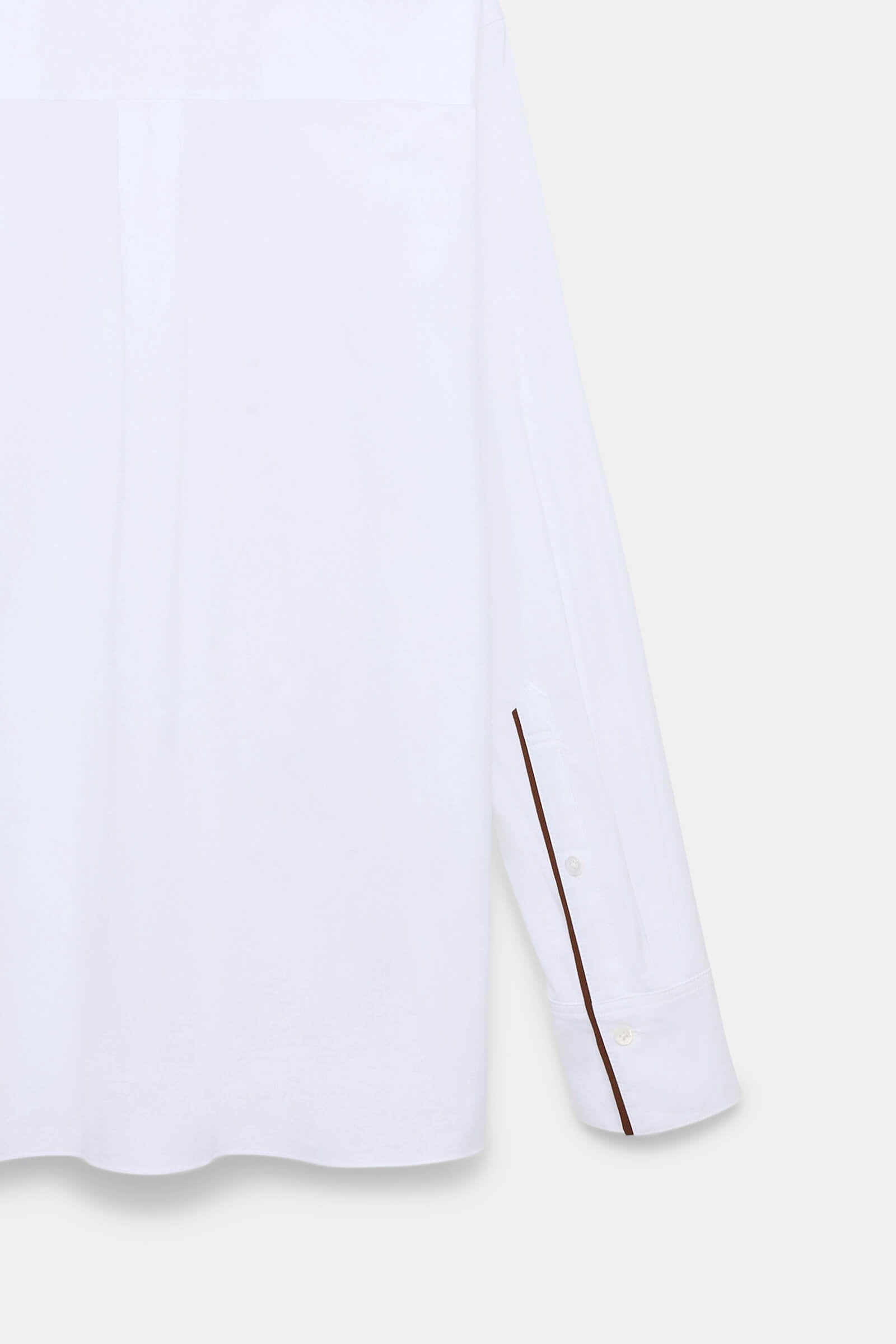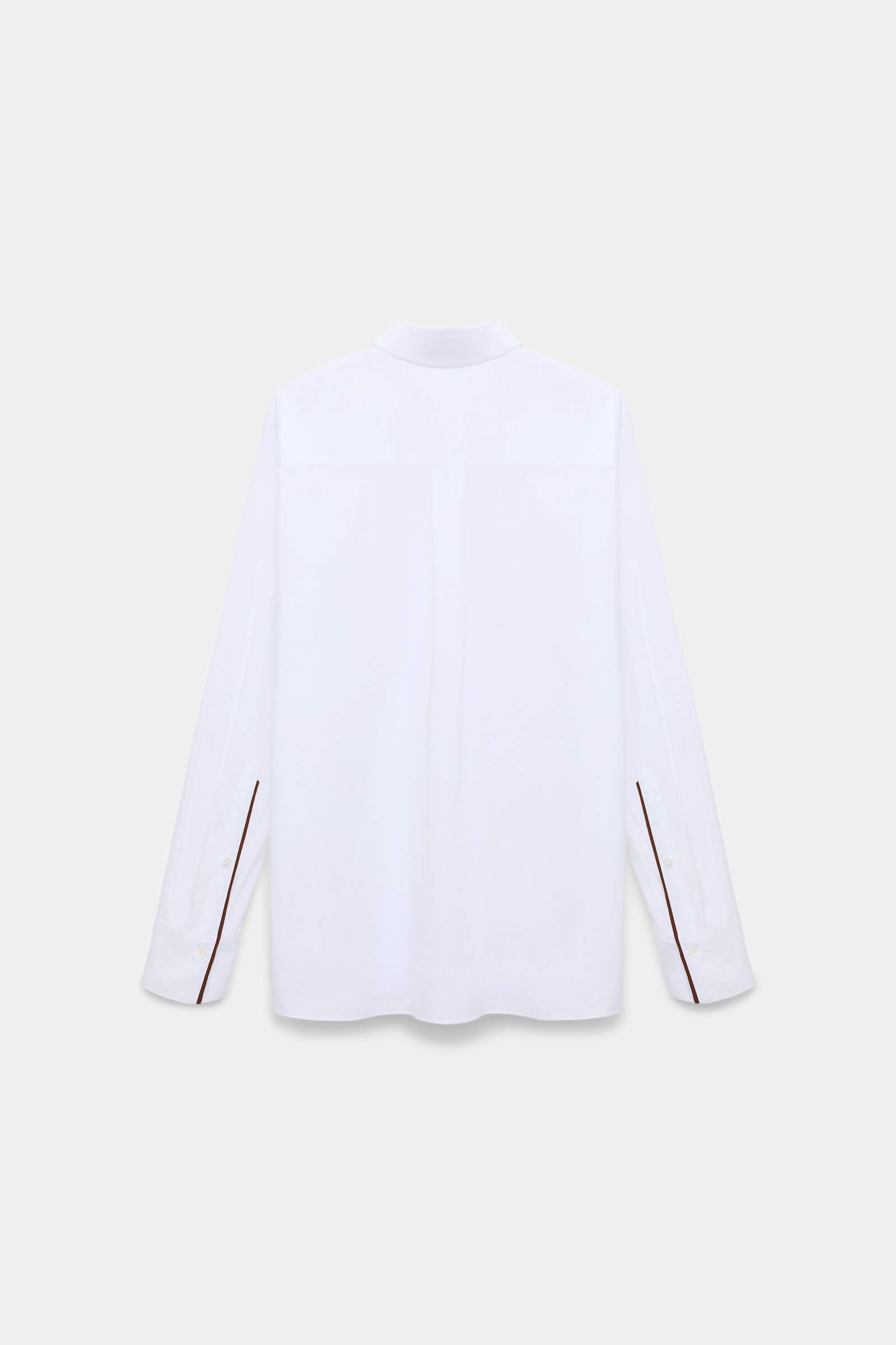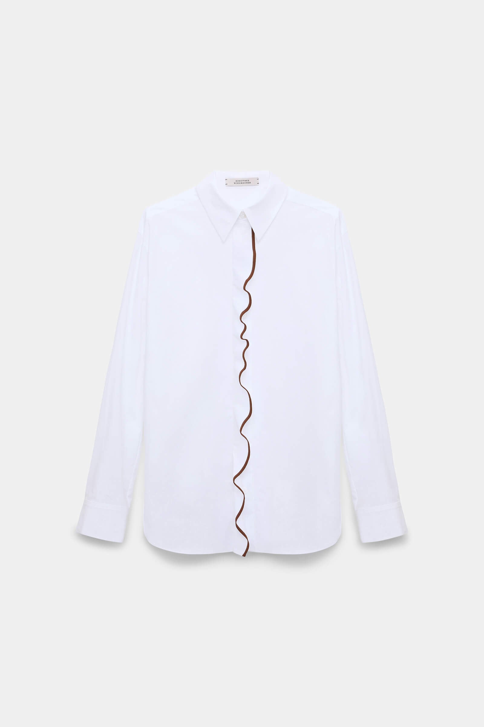 Relaxed fit cotton poplin shirt with a ruffled hidden button placket and contrast piping on the placket and cuffs. Features a classic collar, button-slit cuffs, and a back yoke with box pleat.