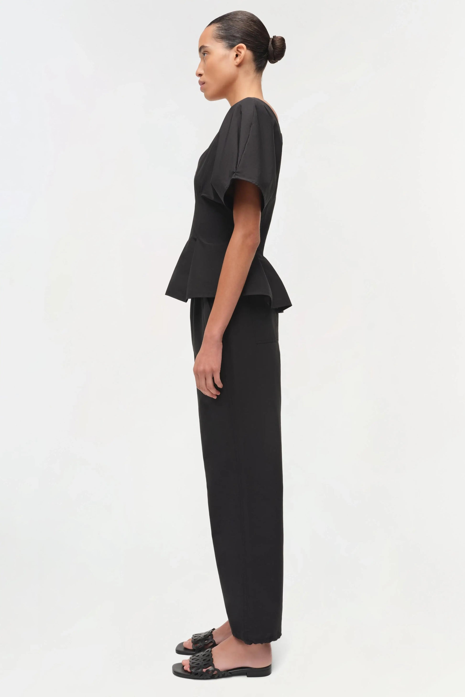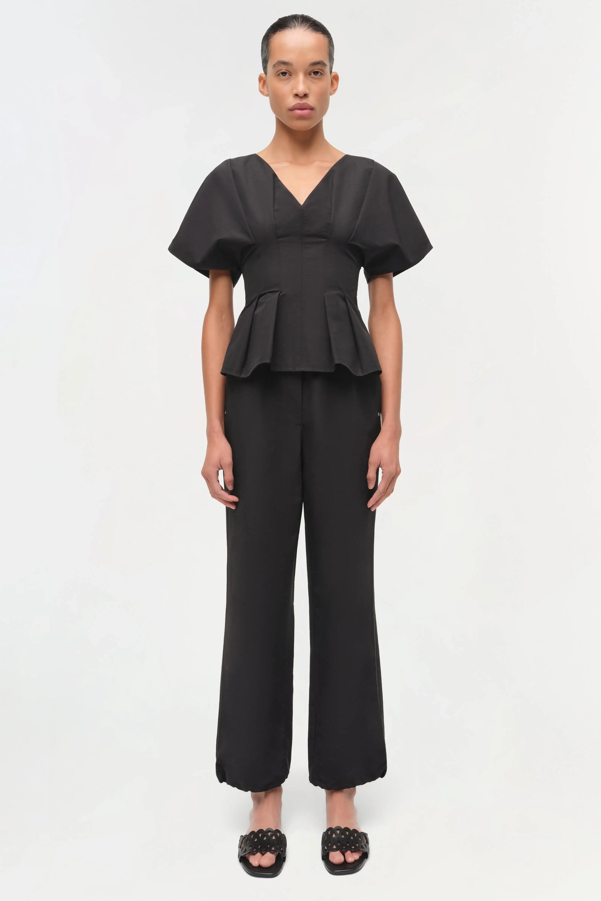 Tailored yet effortless, the Rozen Top brings refined structure to an easy, wearable silhouette. Crafted from crisp cotton faille, it features a flattering open V-neck and delicate pintuck detailing that releases into sculpted pleats at the hem. The peplum shape adds just the right amount of drama, making it a polished choice for both daytime plans and evening outings.