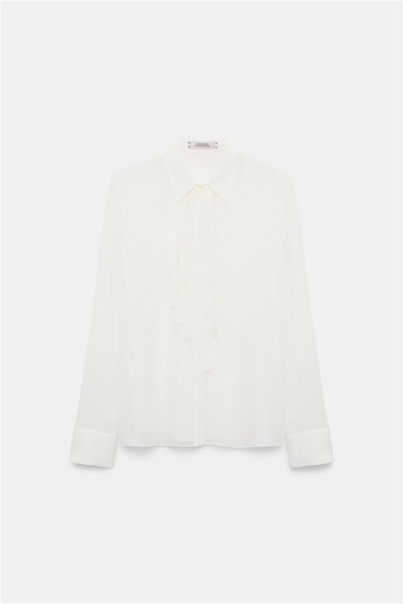 The georgette blouse has a relaxed fit and twisted edge detailing on the asymmetrical plastron. The shirt has a back yoke with an inverted pleat.