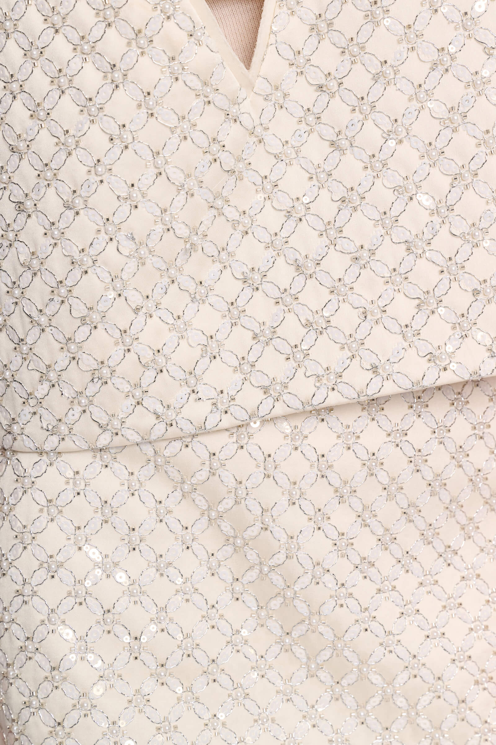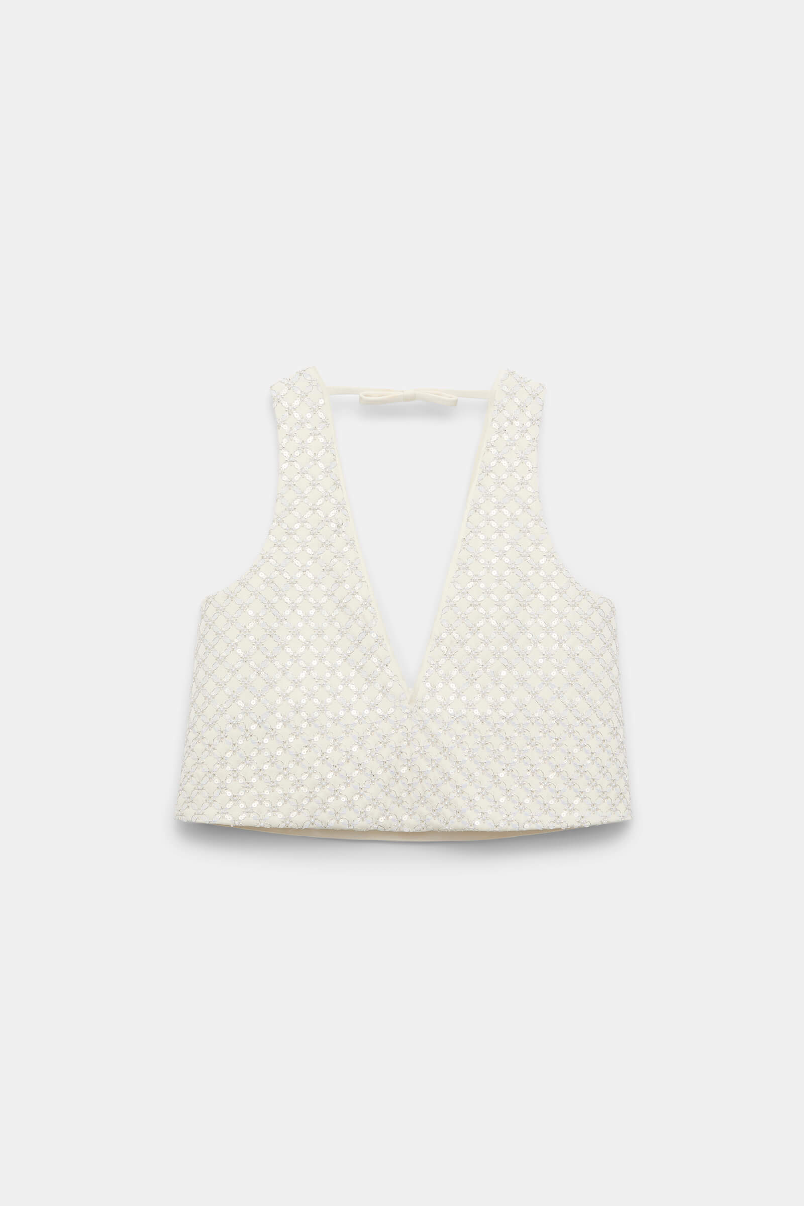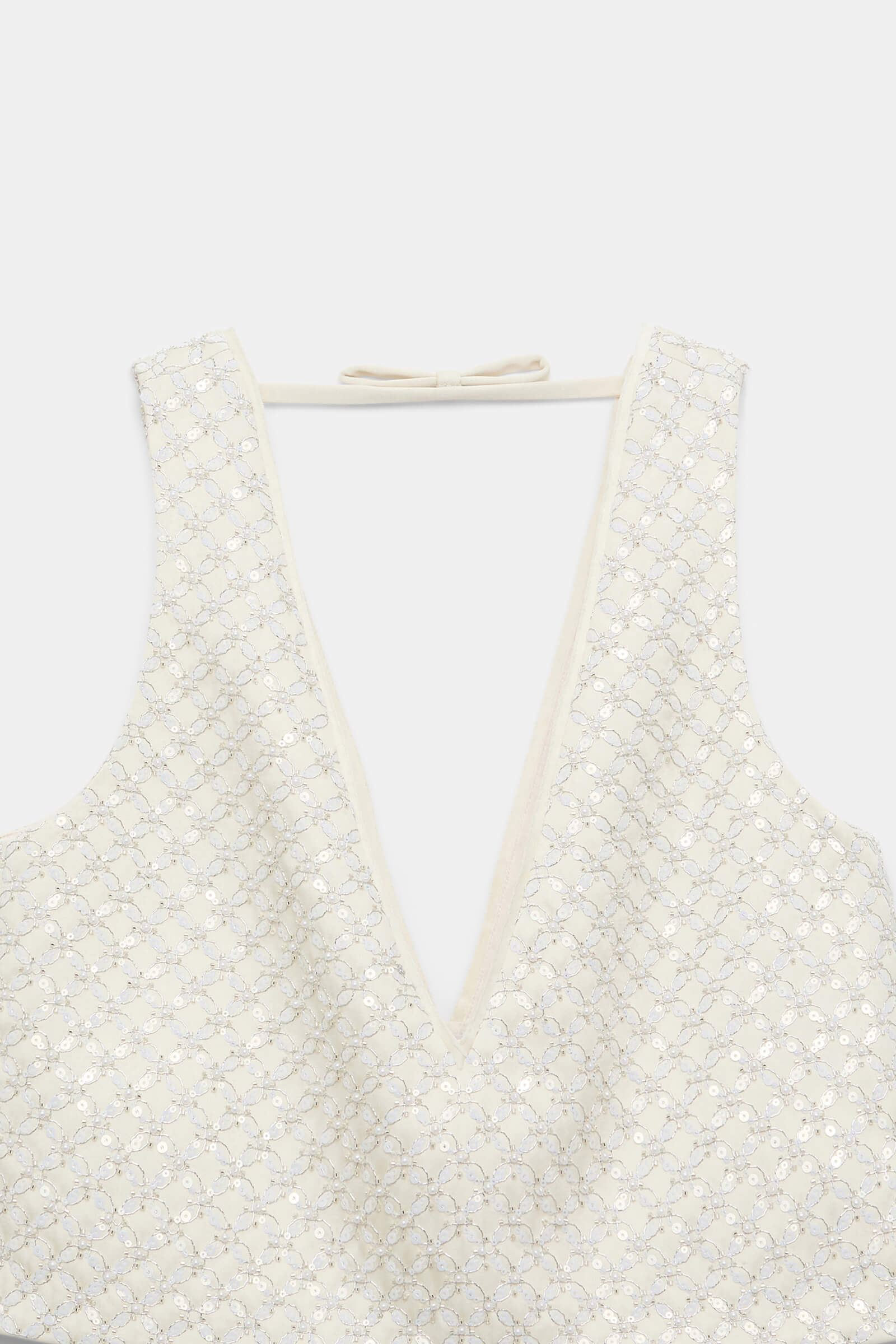 Cropped silhouette crafted from Duchesse with a structured feel. Features a deep V-neckline at the front and back, finished with a delicate strap and bow detail at the back. Made from a polyester-viscose blend with allover floral sequin embellishment.