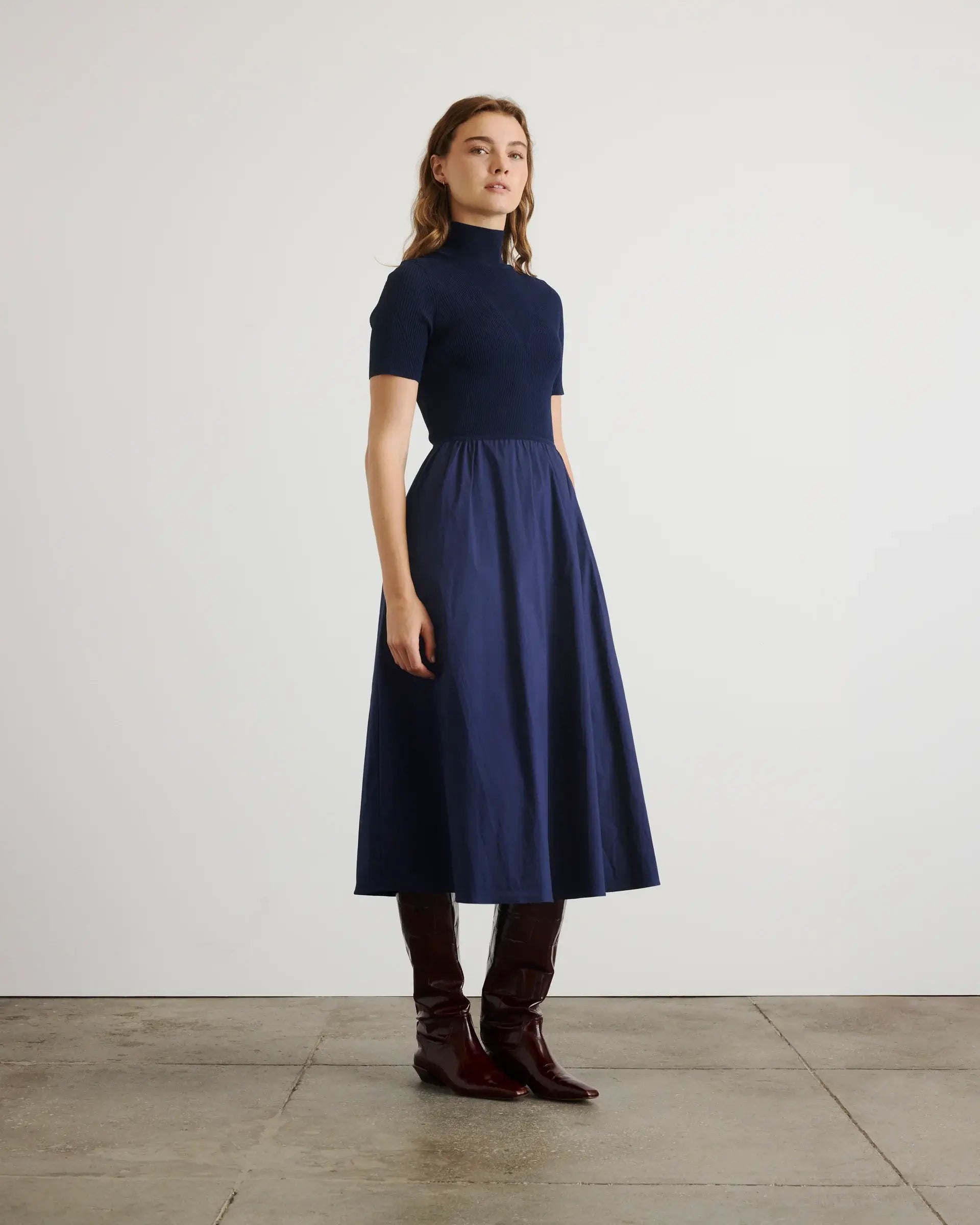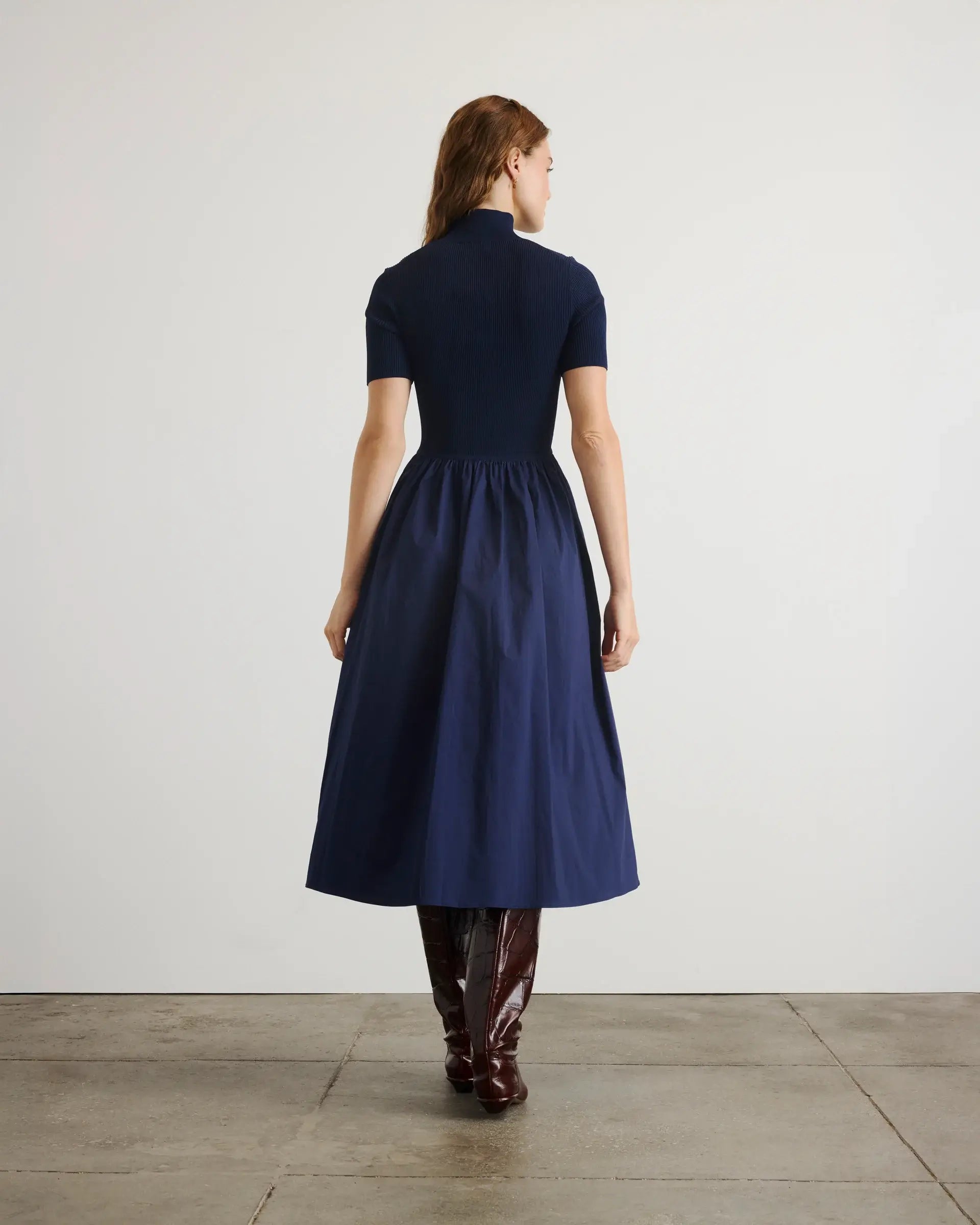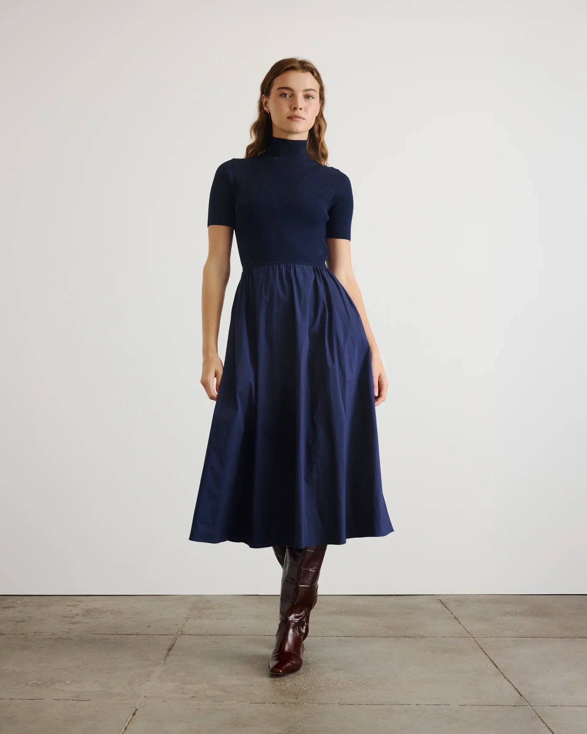Lightweight, stretchy knit meets effortless cotton poplin in this season's Teresa Dress, the combo midi dress redefining the poplin staple for the season.