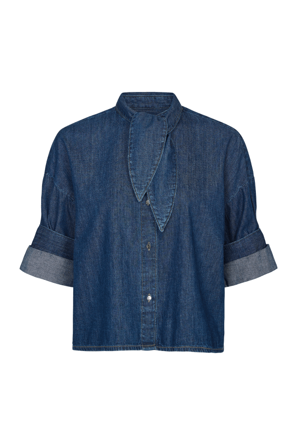 Cropped button-down in lightweight denim shirting. Boxy silhouette with long sleeves and signature double-roll button cuffs. Features an attached neck tie, chest patch pocket, band collar, and button-front placket. 100% cotton.