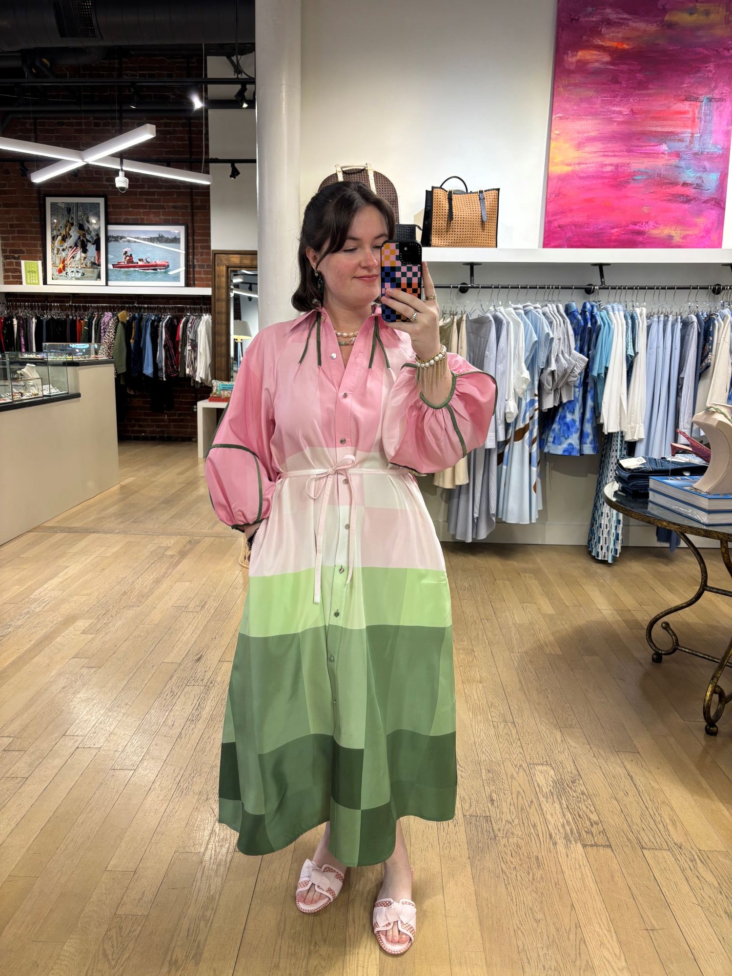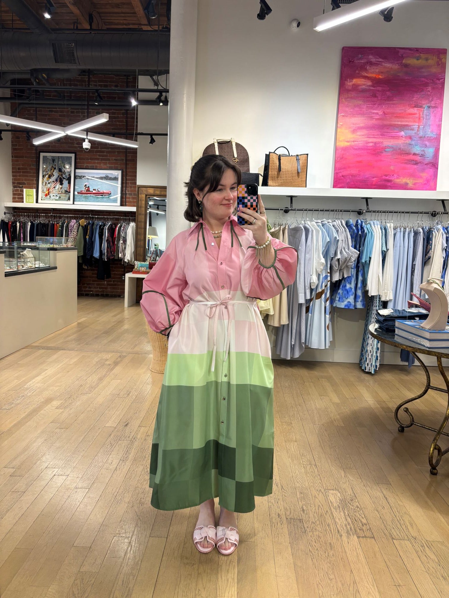 A true statement piece, the Zahara Dress 02 blends color and geometry in the most striking way. The ombré effect fades from soft pink at the top to vibrant green at the hem, accented by a bold geometric pattern that feels modern and artful. Green piping adds a crisp finishing touch, while the removable thin belt lets you choose the vibe—cinched for definition or worn loose for an effortless, fluid silhouette.