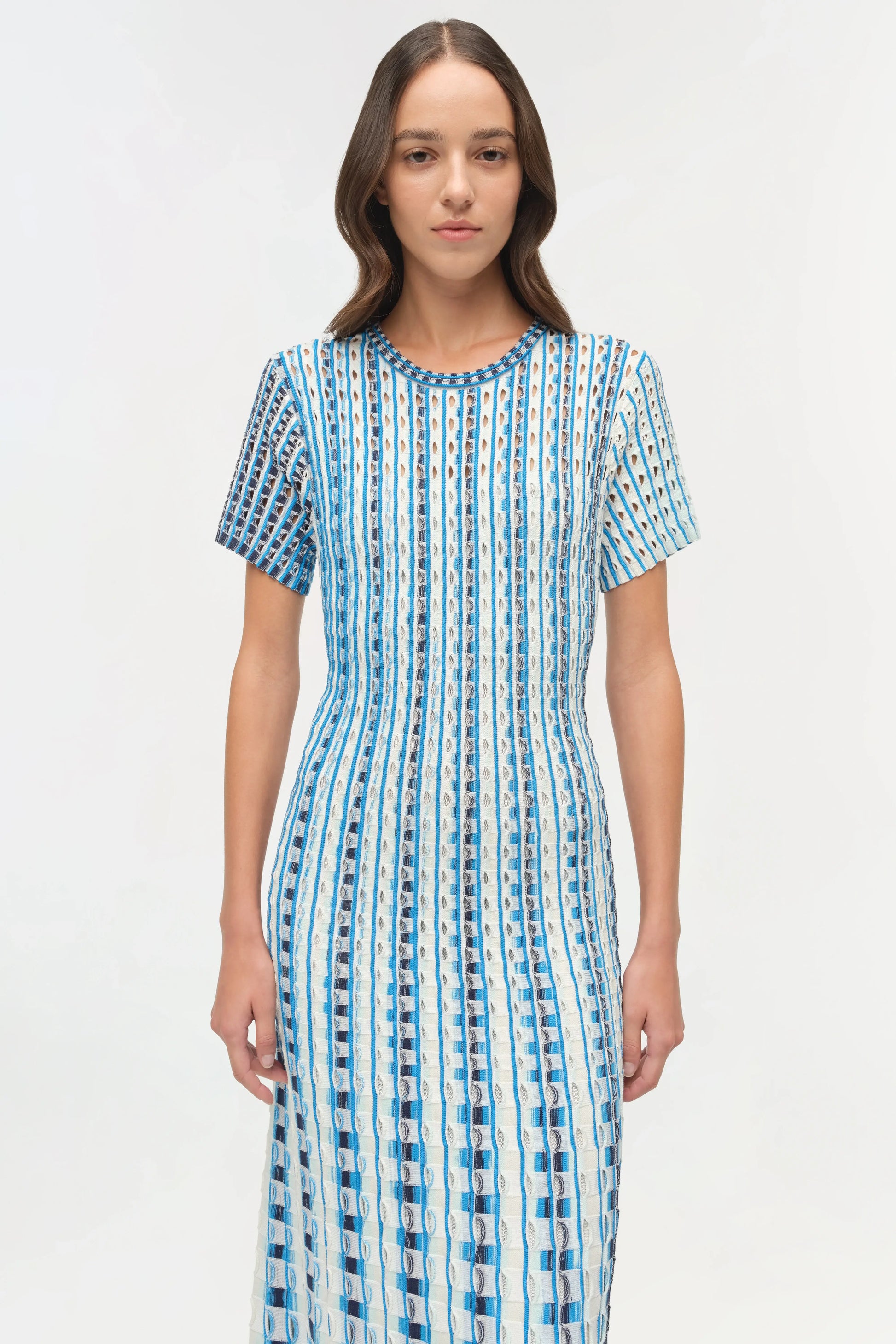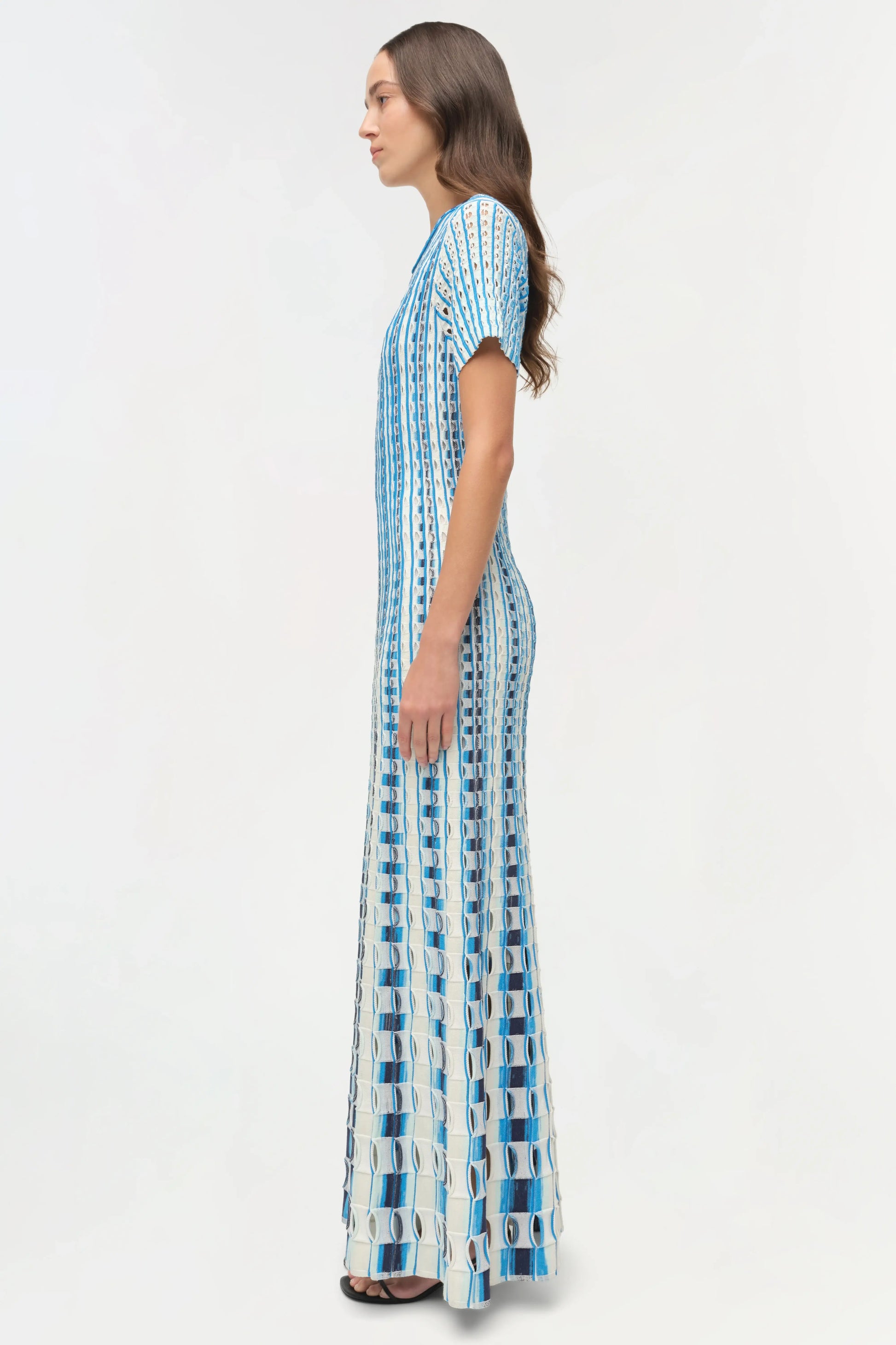 This dress is all about texture, movement, and quiet drama. Knit in an open eyelet construction, the Zaida softly contours the body before flowing into a subtle flare at the hem. The vertical lines elongate the silhouette, while the airy knit adds dimension and ease. Polished yet effortless, it’s a standout piece that moves beautifully with you.